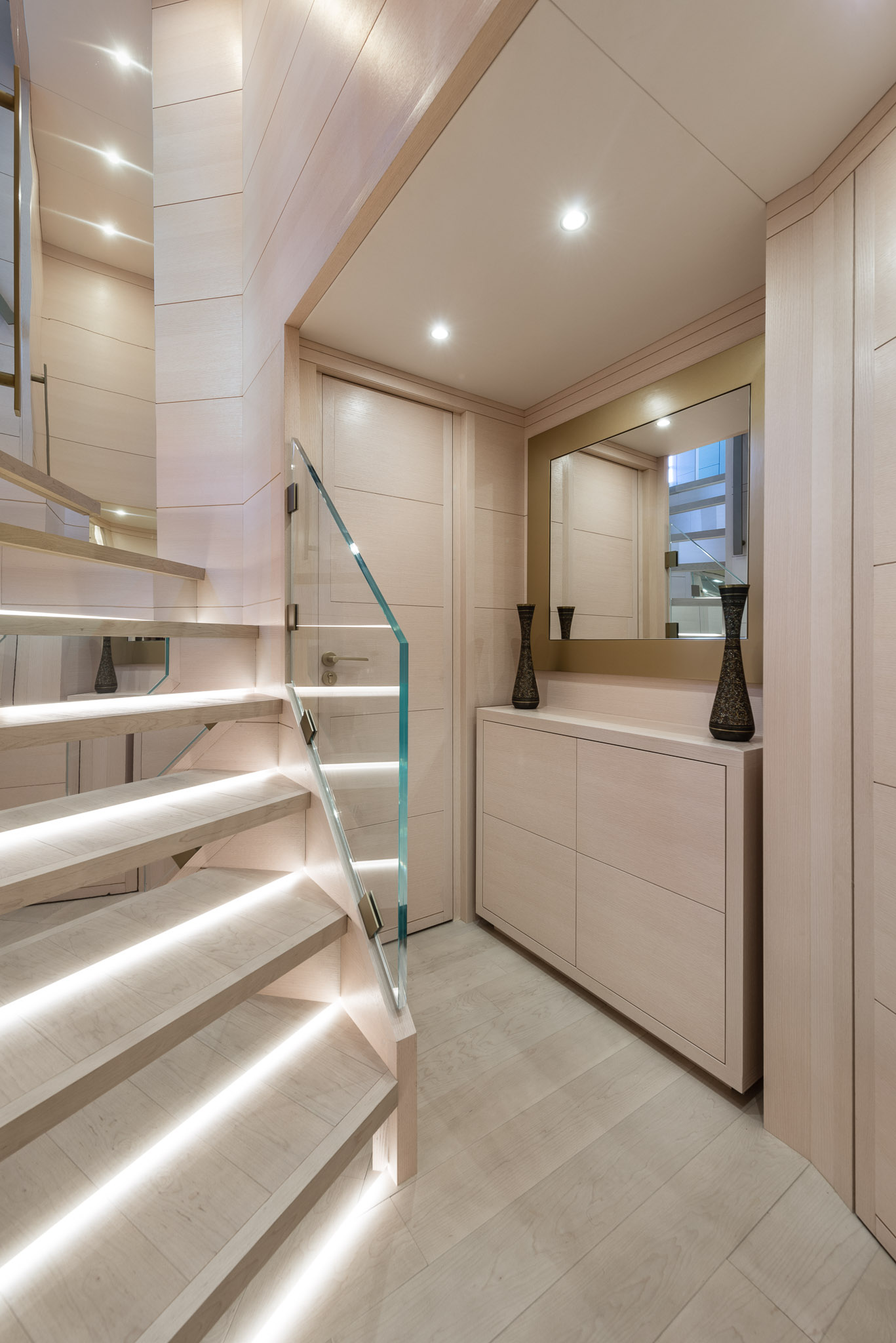 She measures 30.5m/100ft and has a shallow draft of 1.7m/5.6ft, with spacious modern interiors created by Fossati Design Bureau of Turin.