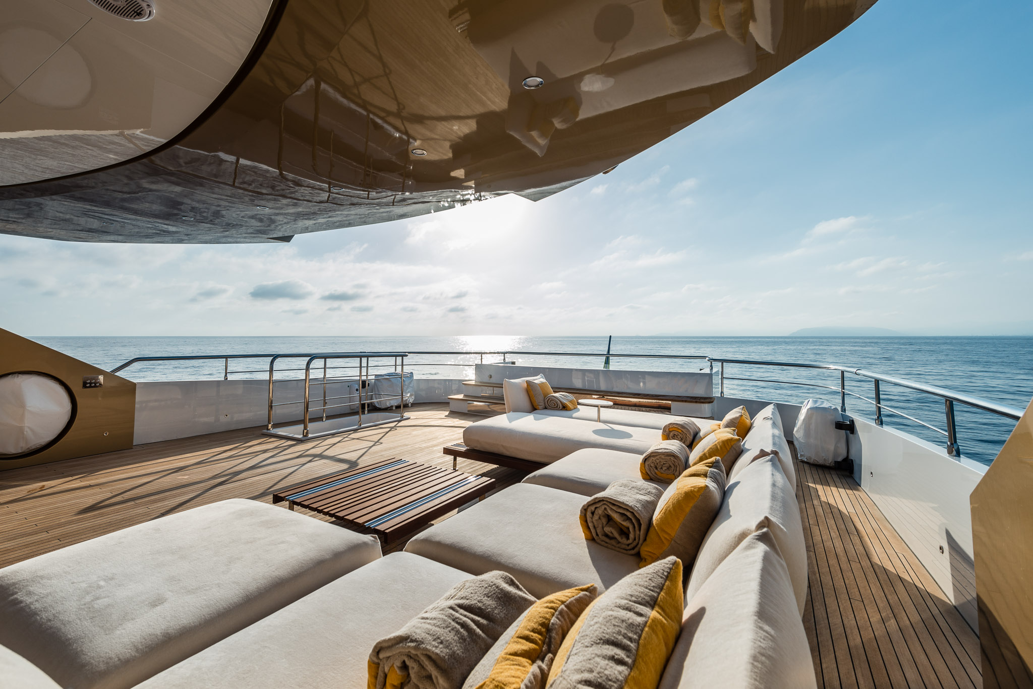 She measures 30.5m/100ft and has a shallow draft of 1.7m/5.6ft, with spacious modern interiors created by Fossati Design Bureau of Turin.