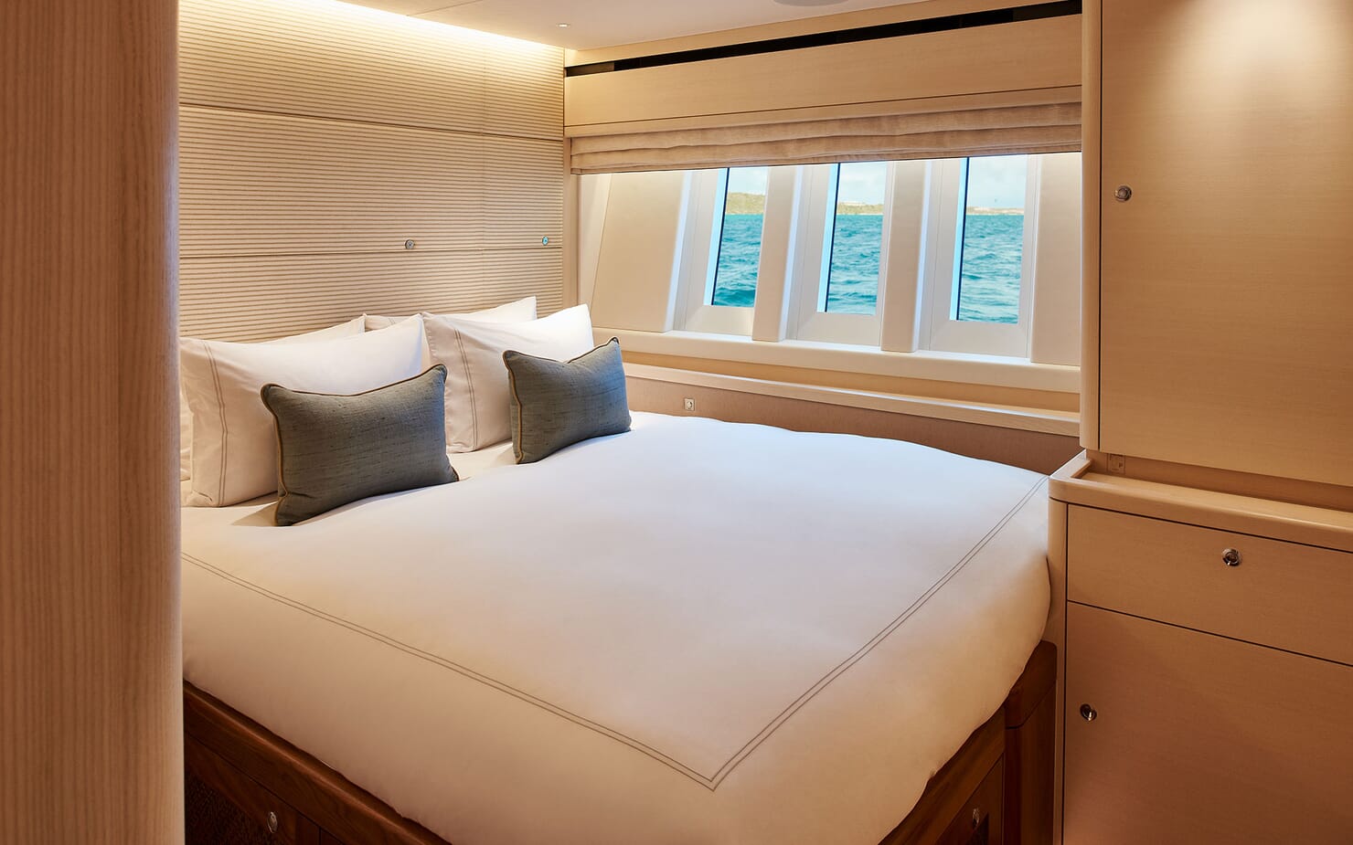 The yacht is able to accommodate up to 12 guests in 5 cabins and has a crew of 6 on board.