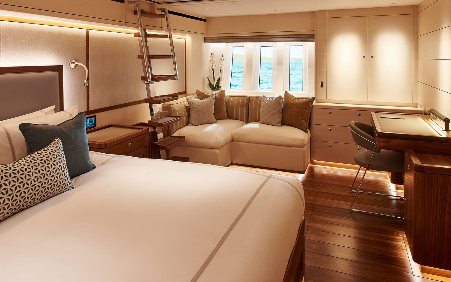 The yacht is able to accommodate up to 12 guests in 5 cabins and has a crew of 6 on board.