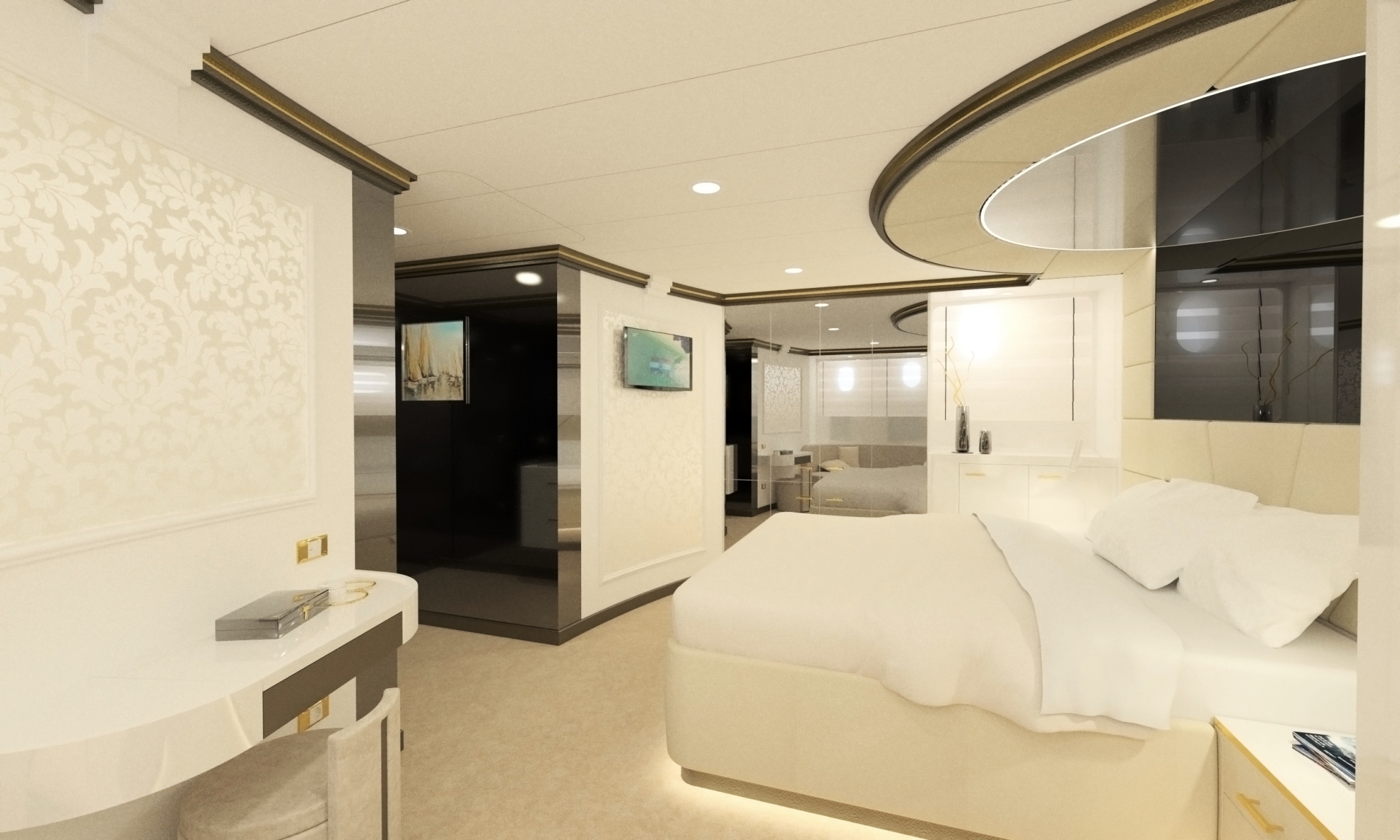 Two staircases lead up to the main deck aft, where a broad sunbed lines the stern and a circular alfresco dining table creates a grand outdoor setting for memorable meals.