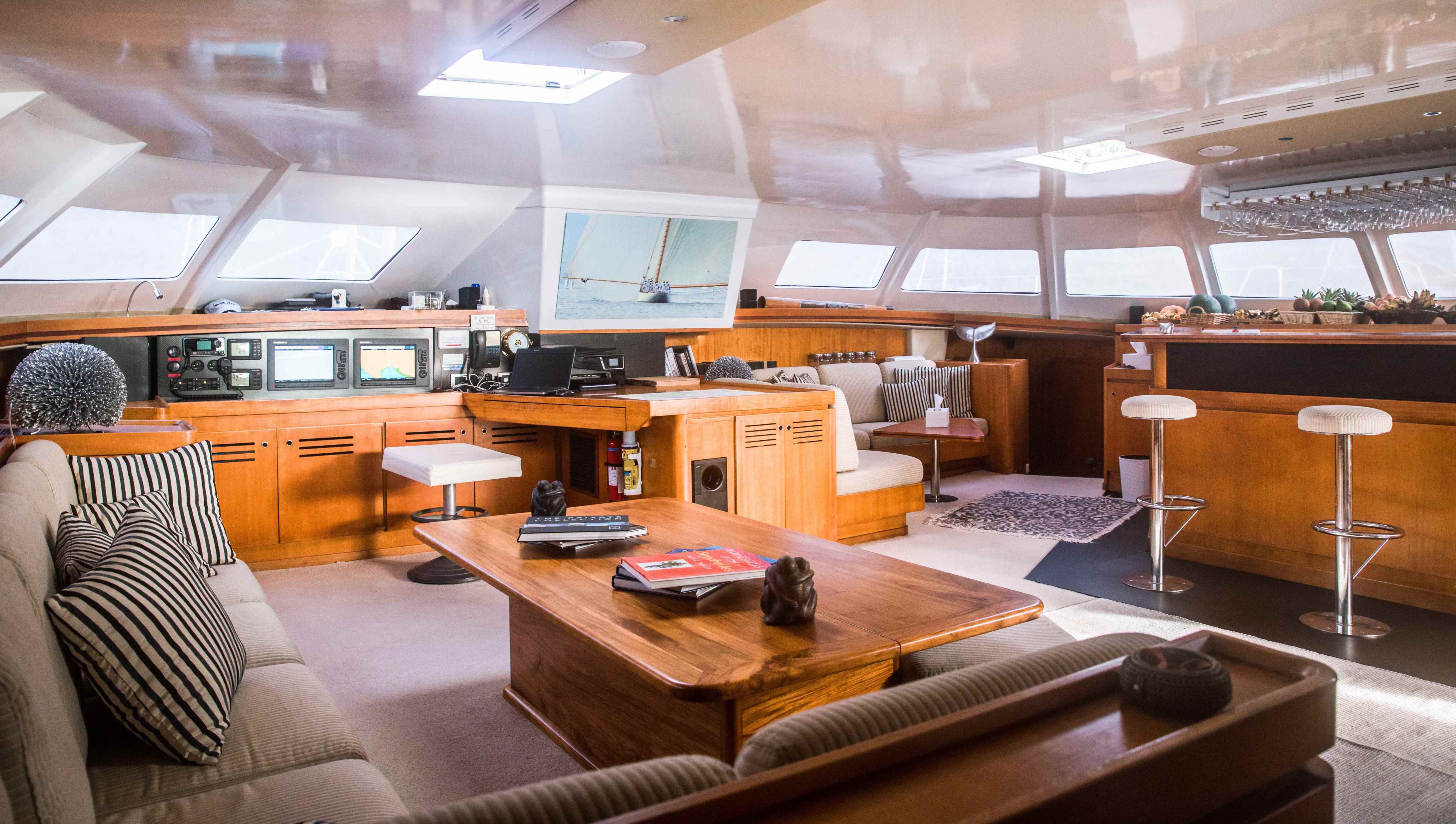 Her interior salon features interior dining, lounge and bar, all in air-conditioned comfort. With warm neutral tones and photos by Gilles Martin - Raget, the salon provides a marvelous area for guests to relax in refined style.