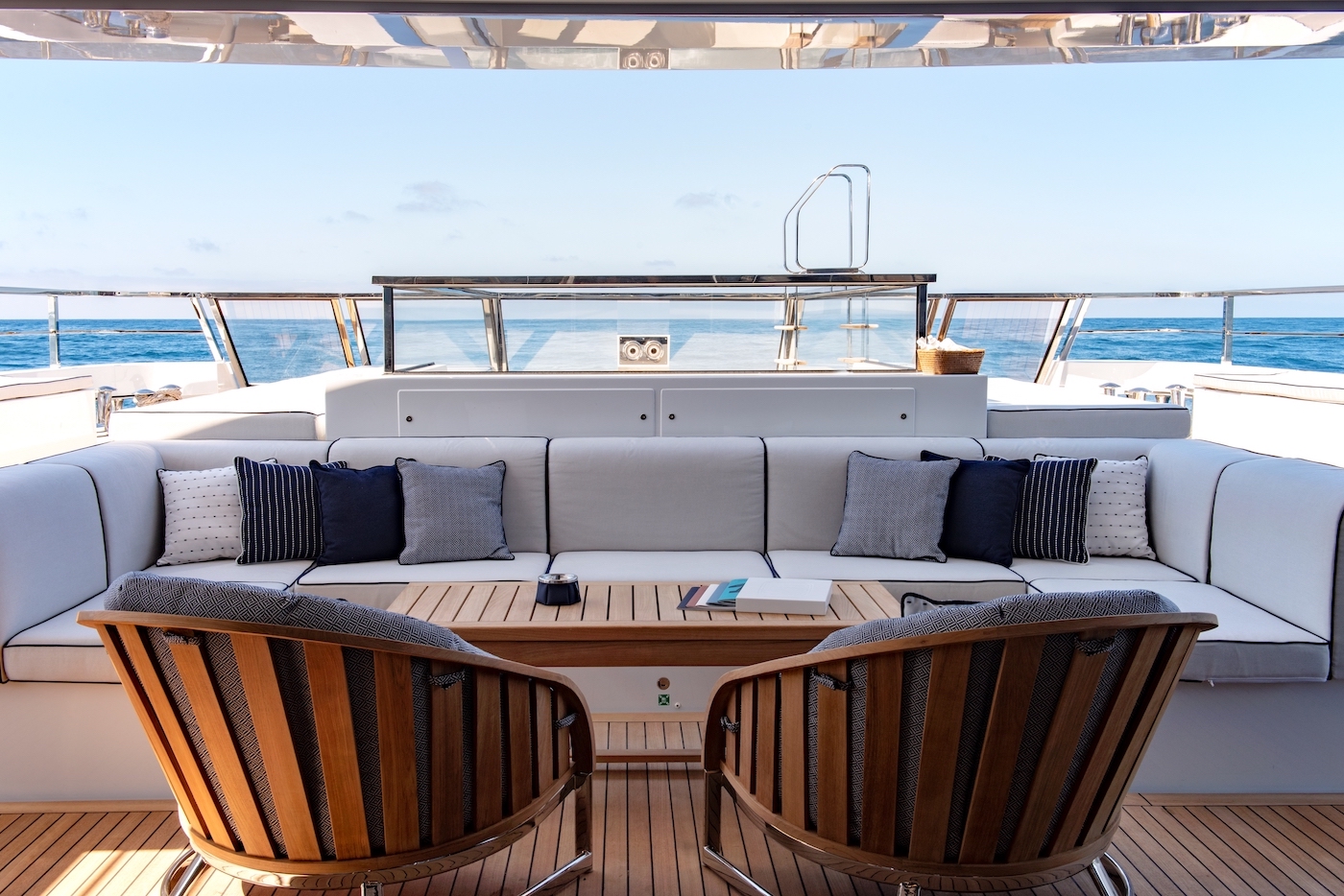 There is direct access to the beach club, and stairways connect up to the main deck aft where guests will find a glass-bottomed swimming pool surrounded by sunpads, and farther forward a C-shaped sofa, armchairs and a coffee ...