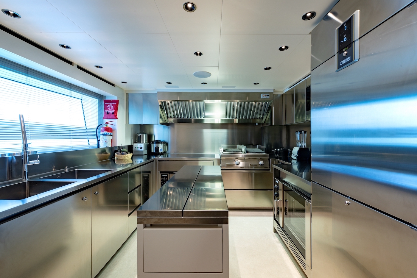 On the main deck, the Master suite is placed forward, followed by the galley, pantry and main foyer into the combined formal dining area and main salon to the aft.