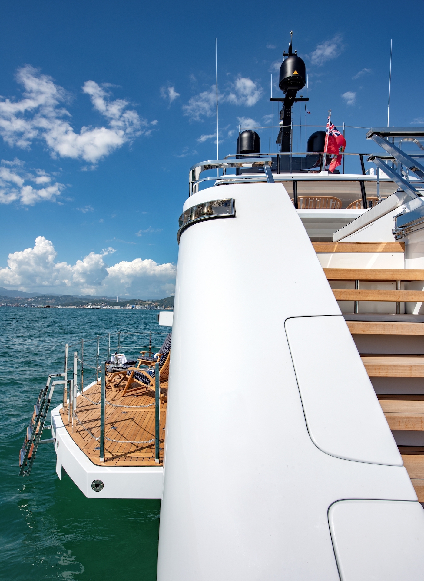 There is direct access to the beach club, and stairways connect up to the main deck aft where guests will find a glass-bottomed swimming pool surrounded by sunpads, and farther forward a C-shaped sofa, armchairs and a coffee ...