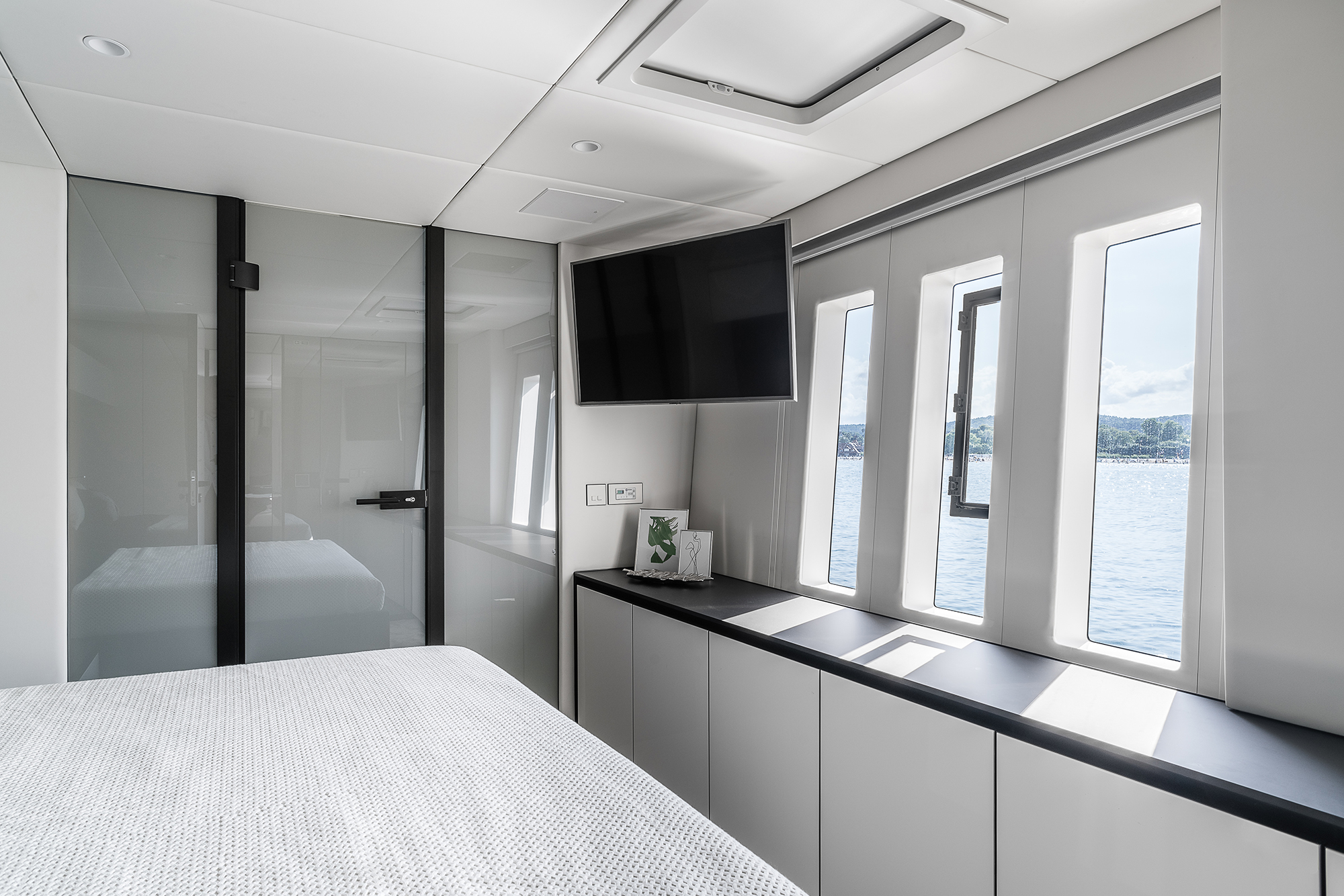The yacht features modern interiors by the shipyard’s in-house team, accommodating up to 8 charter guests in 4 cabins, with ensuite bathroom facilities. There is a crew of 5 onboard.