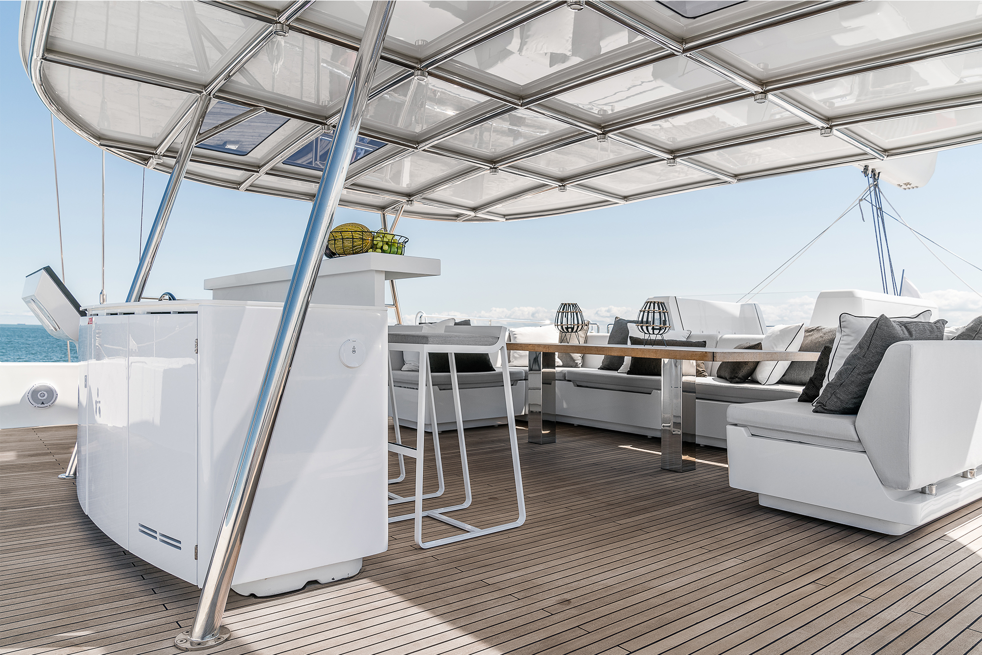 The luxury catamaran yacht ABOVE & BEYOND (ex ABOVE) is a 23.87m (78' 4") luxury sailing yacht built by Sunreef Yachts. The yacht features modern interiors by the shipyard’s in-house team, accommodating up to 8 charter guests in 4 cabins, with ensuite bathroom facilities. There is a crew of 5 onboard.