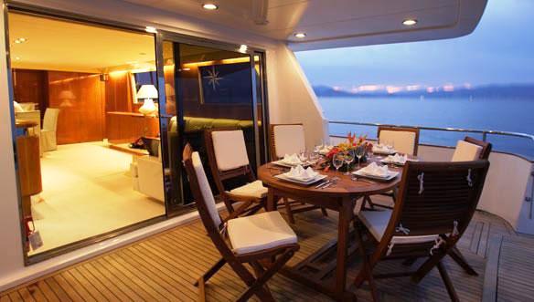 On the Aft deck seating for 8 guests allows shelter and amazing views of the clear turquoise water, seen even in the evening with the help of the aft deck flood lights under the water. The crewed charter yacht ROA also has ample room for sun lovers on the top deck where you can listen to your favorite tunes on the Stereo.