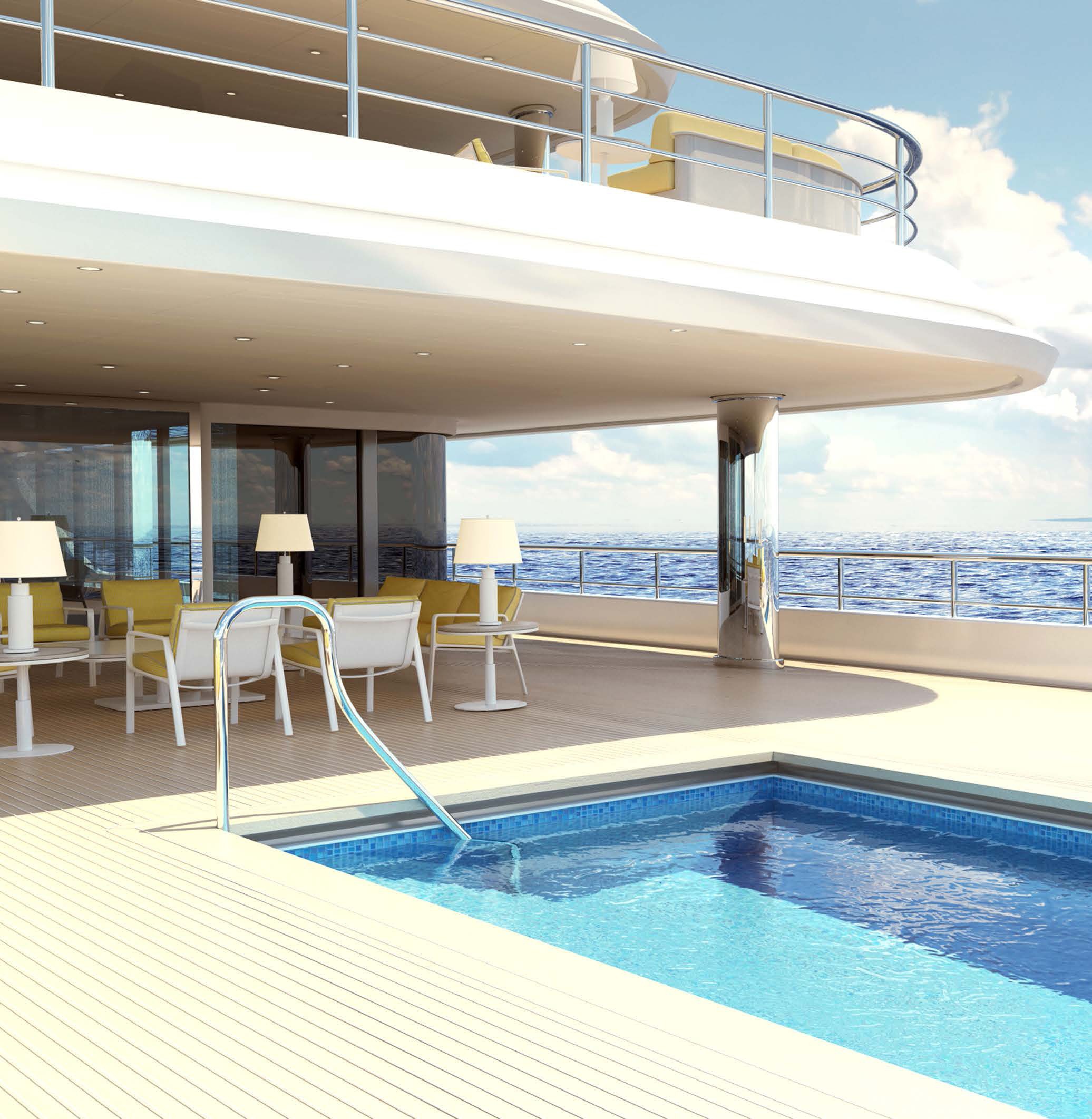 Two stairways connect up to the main deck aft, where there is a swimming pool down the centre and sun loungers placed on both sides.