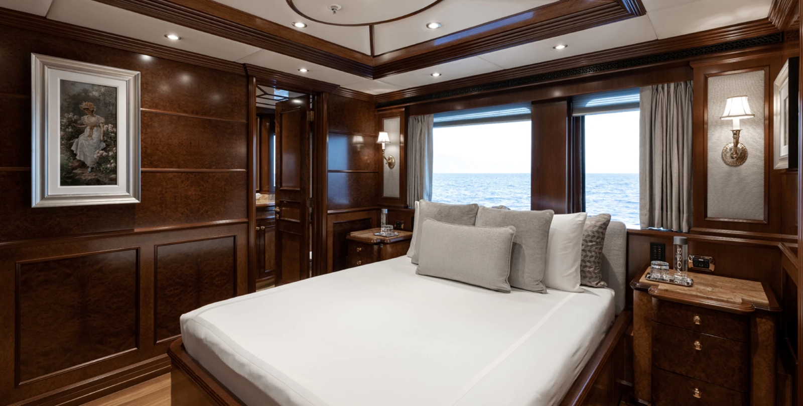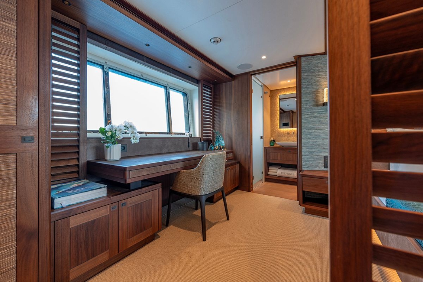 The VIP stateroom is starboard aft and has a king size bed, vanity, desk, and ensuite bathroom with double sinks. There are two guest staterooms with queen size beds in them, with the third stateroom having twin beds. All guest rooms have ensuites and Tvs.