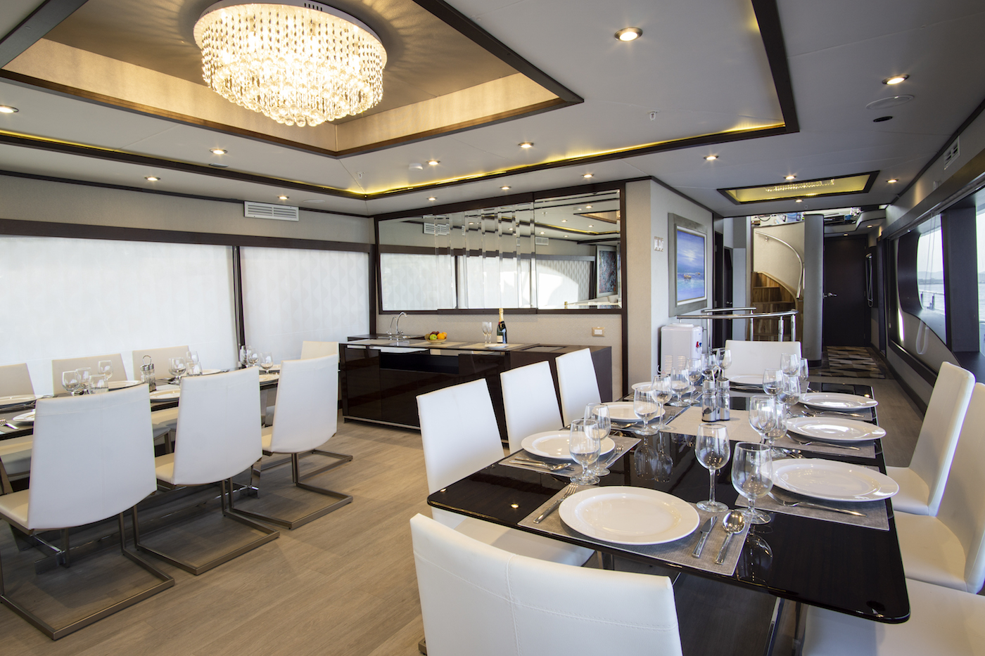 Amidships is a forward-facing C-shaped sofa with an elevated table for casual dining in the sunshine. Behind, there is a raised Jacuzzi for guests to rest in the sunshine and the stern is used for storing the tender, which is ...