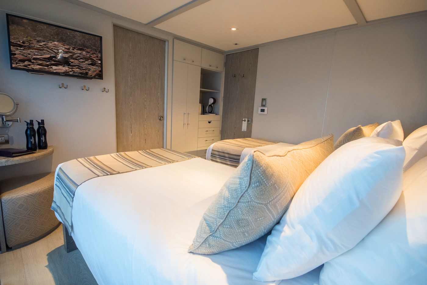 An outstanding, environmentally friendly charter yacht, THEORY offers high-end vacations in the Galapagos for 18 to 20 charter guests, accommodated in 10 beautifully appointed cabins, with ensuite facilities. The yacht operates since 2019, measures 43m (142') and has a professional crew of 13 plus 2 guides on board.