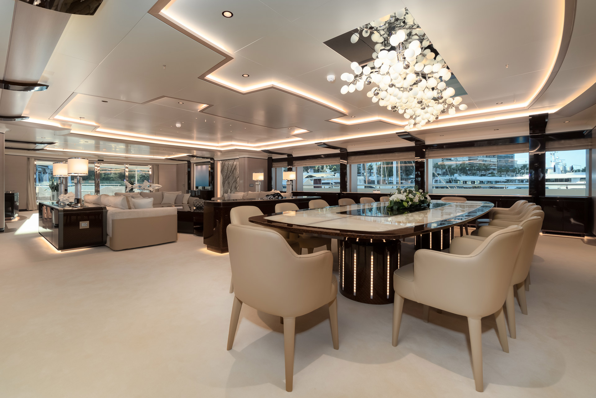 The steel hull and aluminium superstructure provide an excellent balance between function, form and stability, and among her onboard facilities is a Jacuzzi and a Jacuzzi/swimming pool, a helipad, an abundance of alfresco dining and sunbathing areas and a beach club containing a massage room, sauna and steam room.
