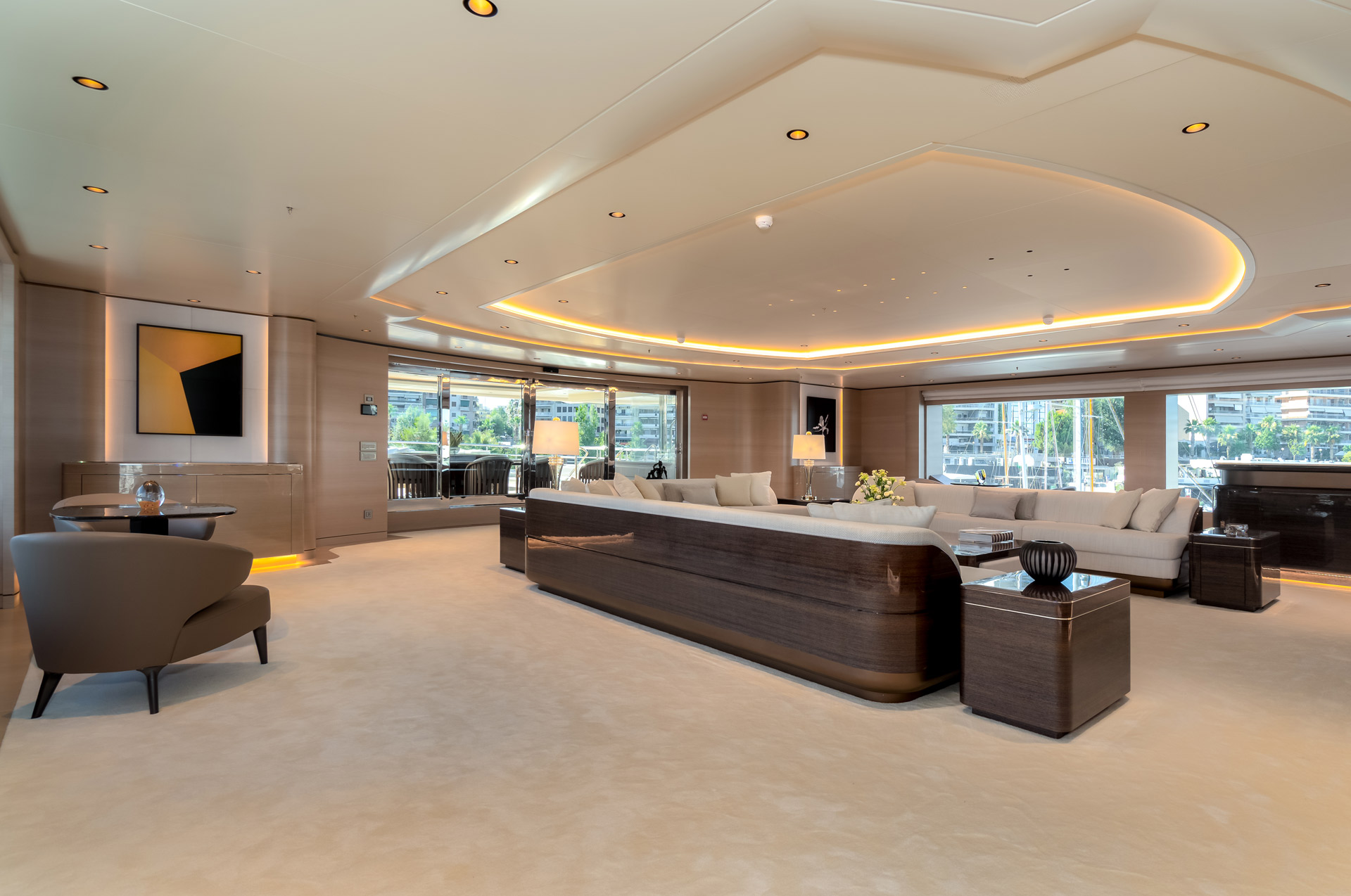 Two stairways lead up to the main deck aft, where a C-shaped sofa lines the stern and two tables create a casual place for the group to dine, drink or spend time on hobbies and conversation in the sunshine.