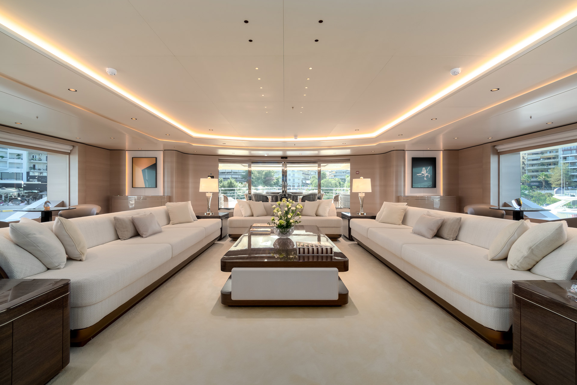 Two stairways lead up to the main deck aft, where a C-shaped sofa lines the stern and two tables create a casual place for the group to dine, drink or spend time on hobbies and conversation in the sunshine.