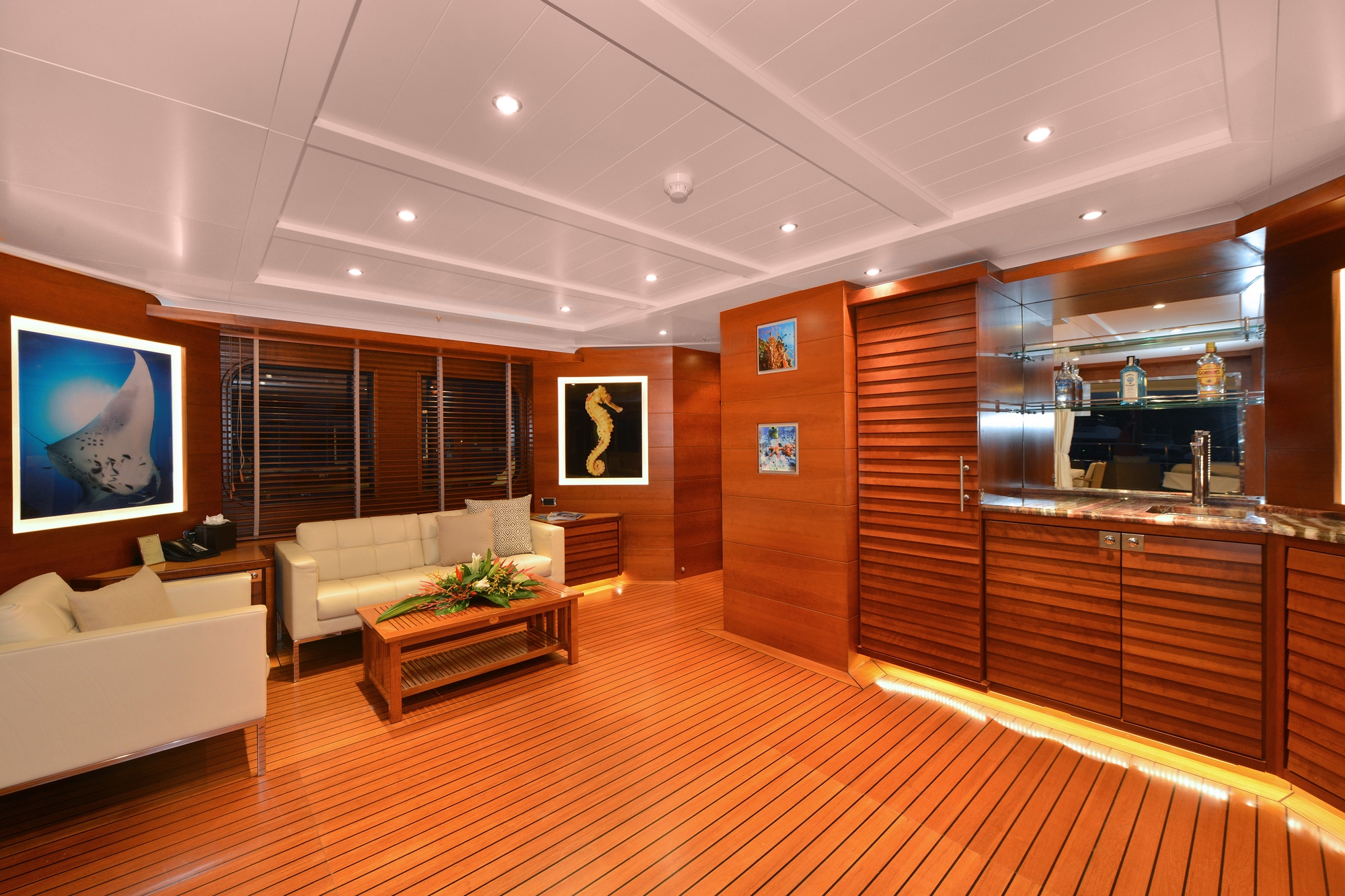 Her full-width master cabin on the main deck has an office on entrance, plentiful wardrobe space, a large bathroom with bath and double shower and underfloor heating. Below are four staterooms, two with double beds and two with twin beds, each with a Pullman bunk option. All bathrooms have floor heating.