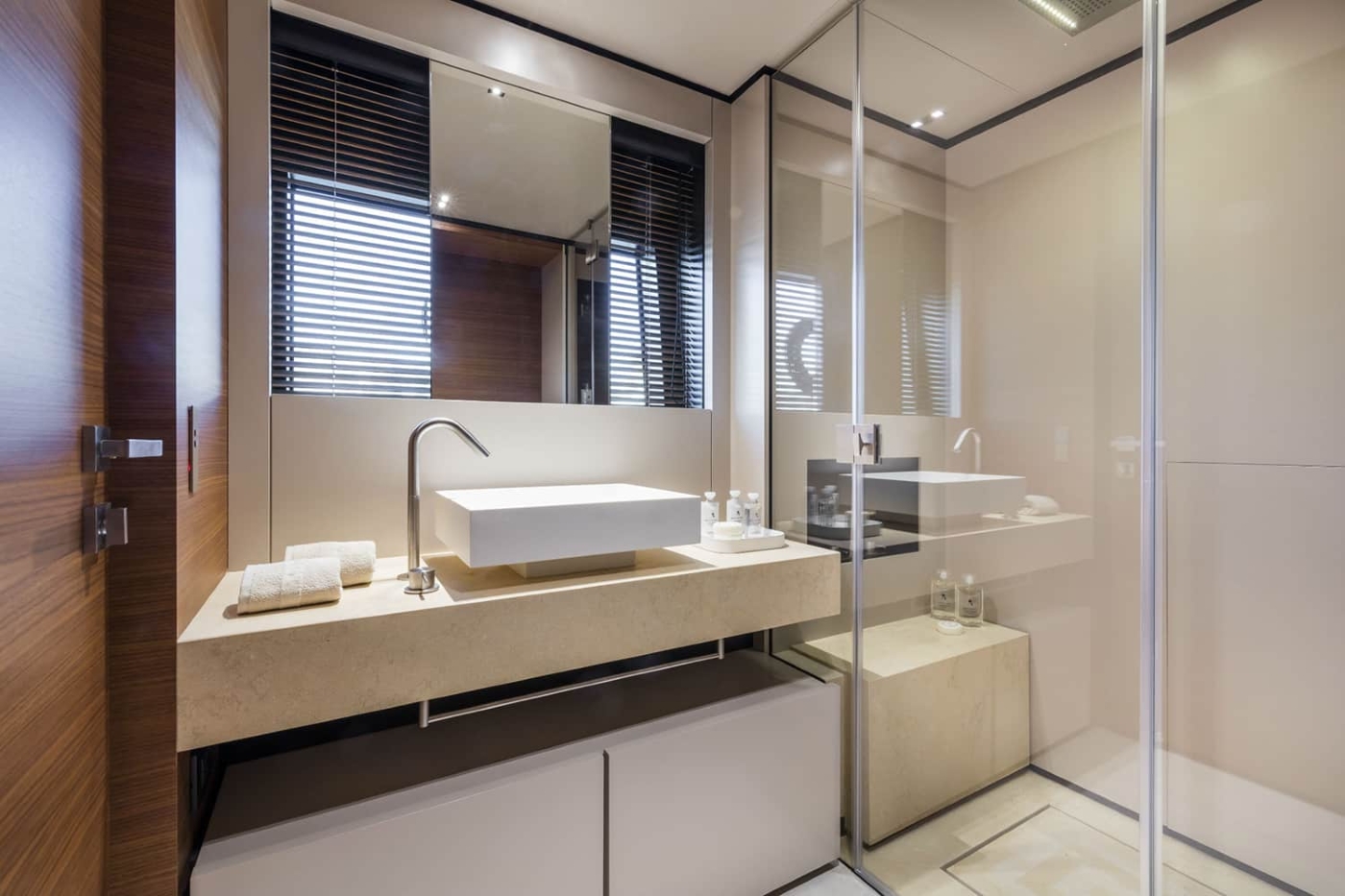 Inside, there is a large wardrobe, a king-sized bed along the aft wall with a widescreen TV opposite, a daybed and a forward en-suite bathroom with his-and-hers sinks, toilets and bidets with a shared central shower.