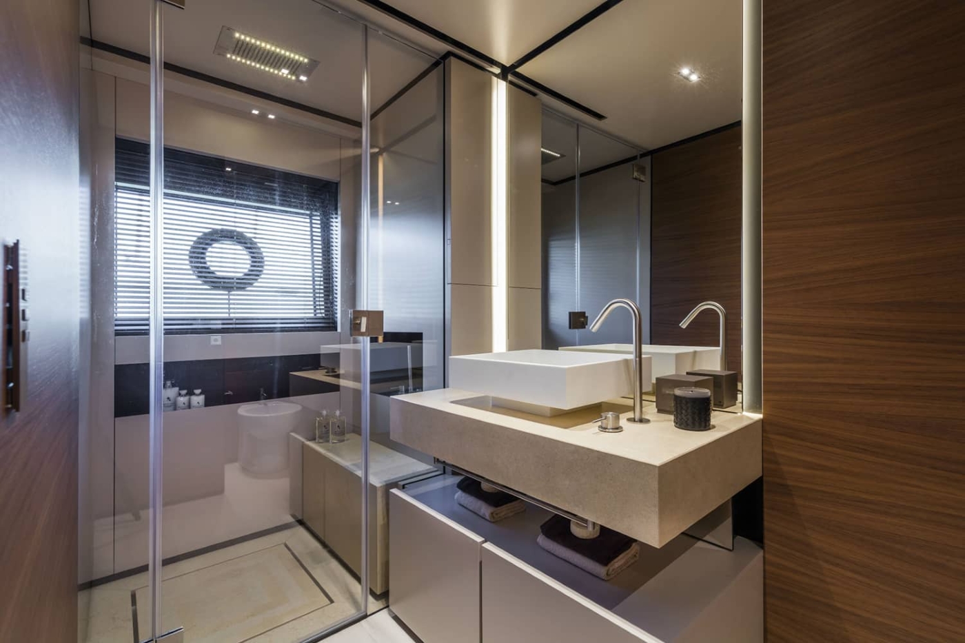 Inside, there is a large wardrobe, a king-sized bed along the aft wall with a widescreen TV opposite, a daybed and a forward en-suite bathroom with his-and-hers sinks, toilets and bidets with a shared central shower.