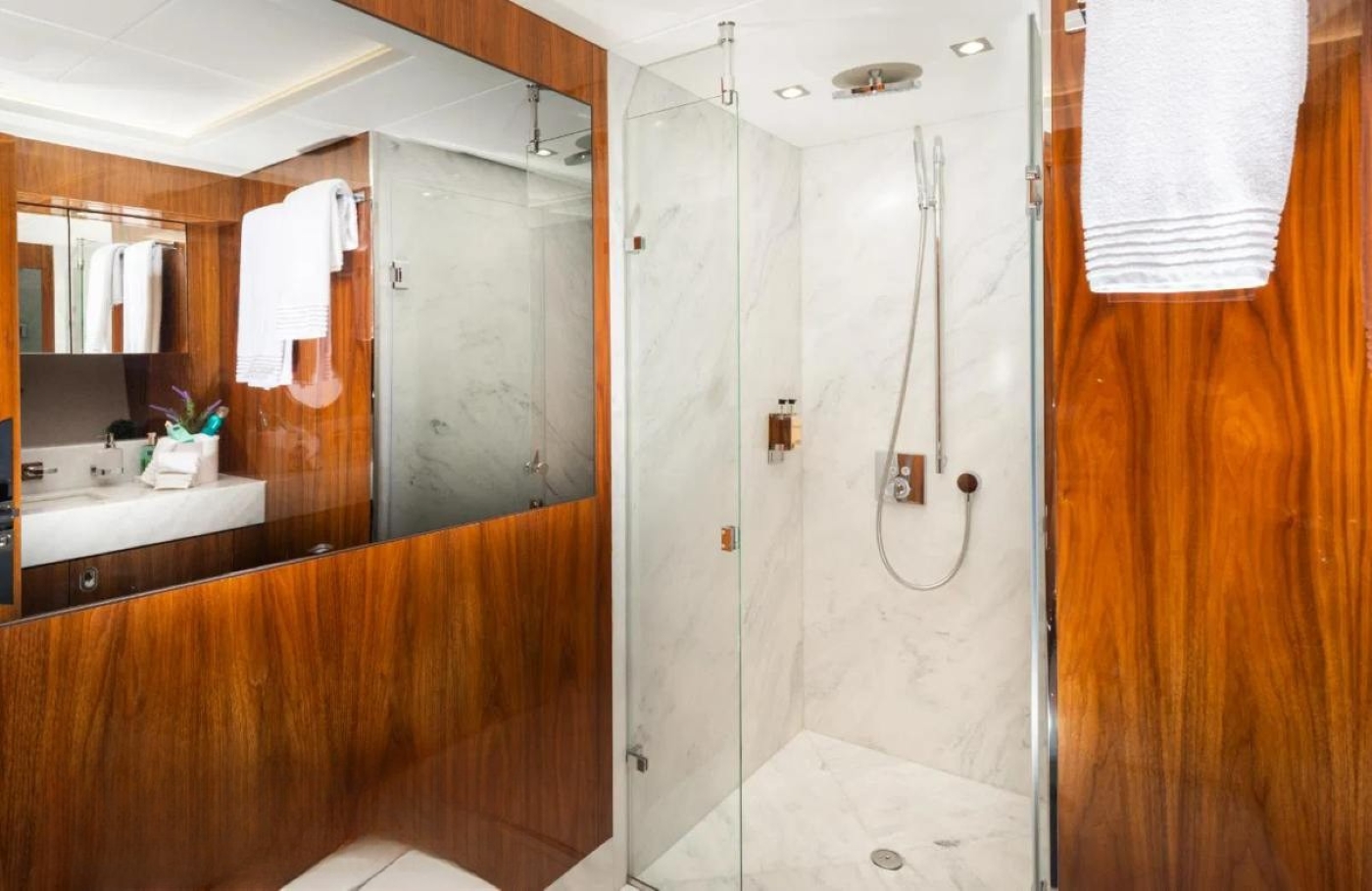 Below deck, following the stairs leading down, there is a spacious VIP stateroom boasting a walk-in wardrobe and a large ensuite bathroom. Another set of stairs, this time from the dining area, lead down to the three guest cabins that offer overnight stay for up to 6 charter guests.