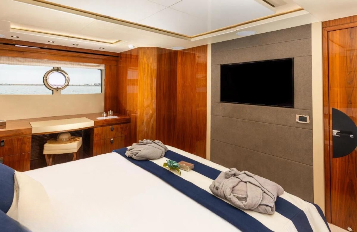 Below deck, following the stairs leading down, there is a spacious VIP stateroom boasting a walk-in wardrobe and a large ensuite bathroom. Another set of stairs, this time from the dining area, lead down to the three guest cabins that offer overnight stay for up to 6 charter guests.