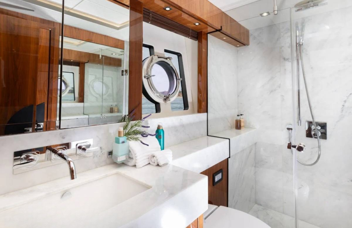 Below deck, following the stairs leading down, there is a spacious VIP stateroom boasting a walk-in wardrobe and a large ensuite bathroom. Another set of stairs, this time from the dining area, lead down to the three guest cabins that offer overnight stay for up to 6 charter guests.