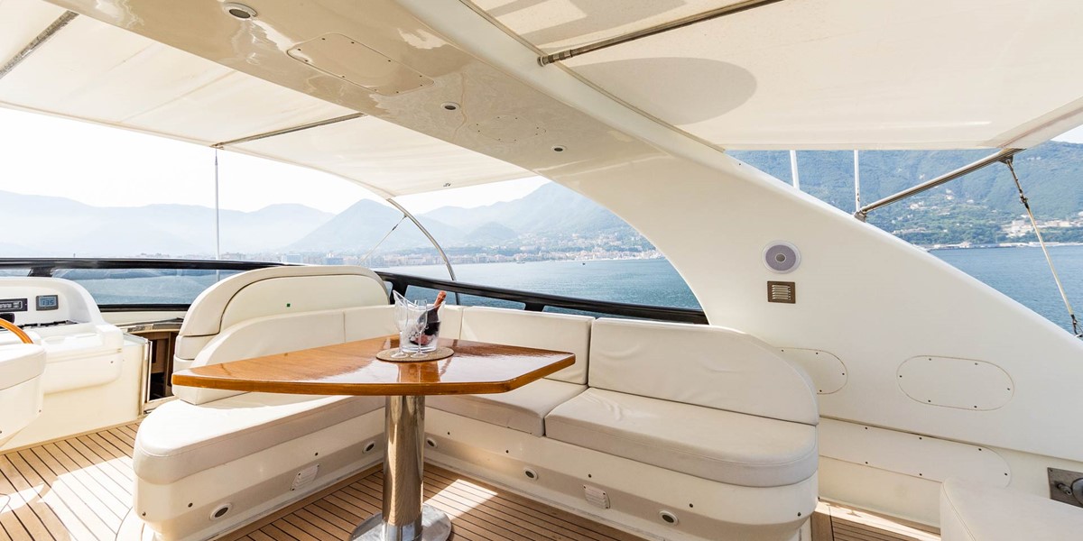 The yacht also has great outdoor deck areas to enjoy, including the aft deck alfresco dining area with partial shade. The yacht can be fully enjoyed thanks to the 360° wrap-around decks. Above, is the flybridge offering an excellent area for entertainment with additional dining option, sun pads, seating, as well as a removable Bimini cover.