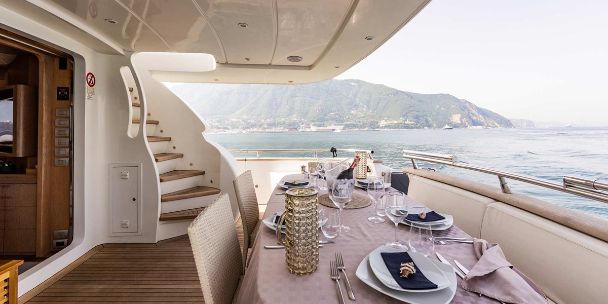 The yacht also has great outdoor deck areas to enjoy, including the aft deck alfresco dining area with partial shade. The yacht can be fully enjoyed thanks to the 360° wrap-around decks. Above, is the flybridge offering an excellent area for entertainment with additional dining option, sun pads, seating, as well as a removable Bimini cover.