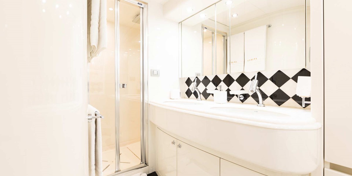 There is a queen-sized bed, a city, small sofa and a walk-in wardrobe as well as the ensuite bathroom with a double sink. ~ The VIP cabin also spreads the entire beam of the yacht and is placed forward with a centre-lined bed. ~ There are two more guests cabins with a twin set up, one with an additional Pullman berth.