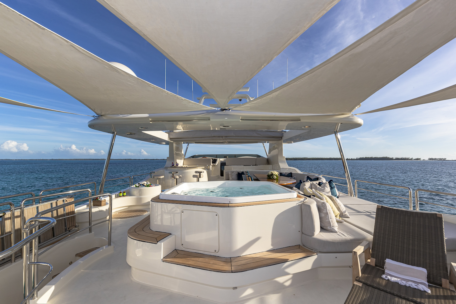 Stairways connect up to the main deck aft, where there is a sofa lining the stern, a raised table for alfresco dining and additional movable chairs. A TV is placed in the forward starboard corner where bar and grill services are ...