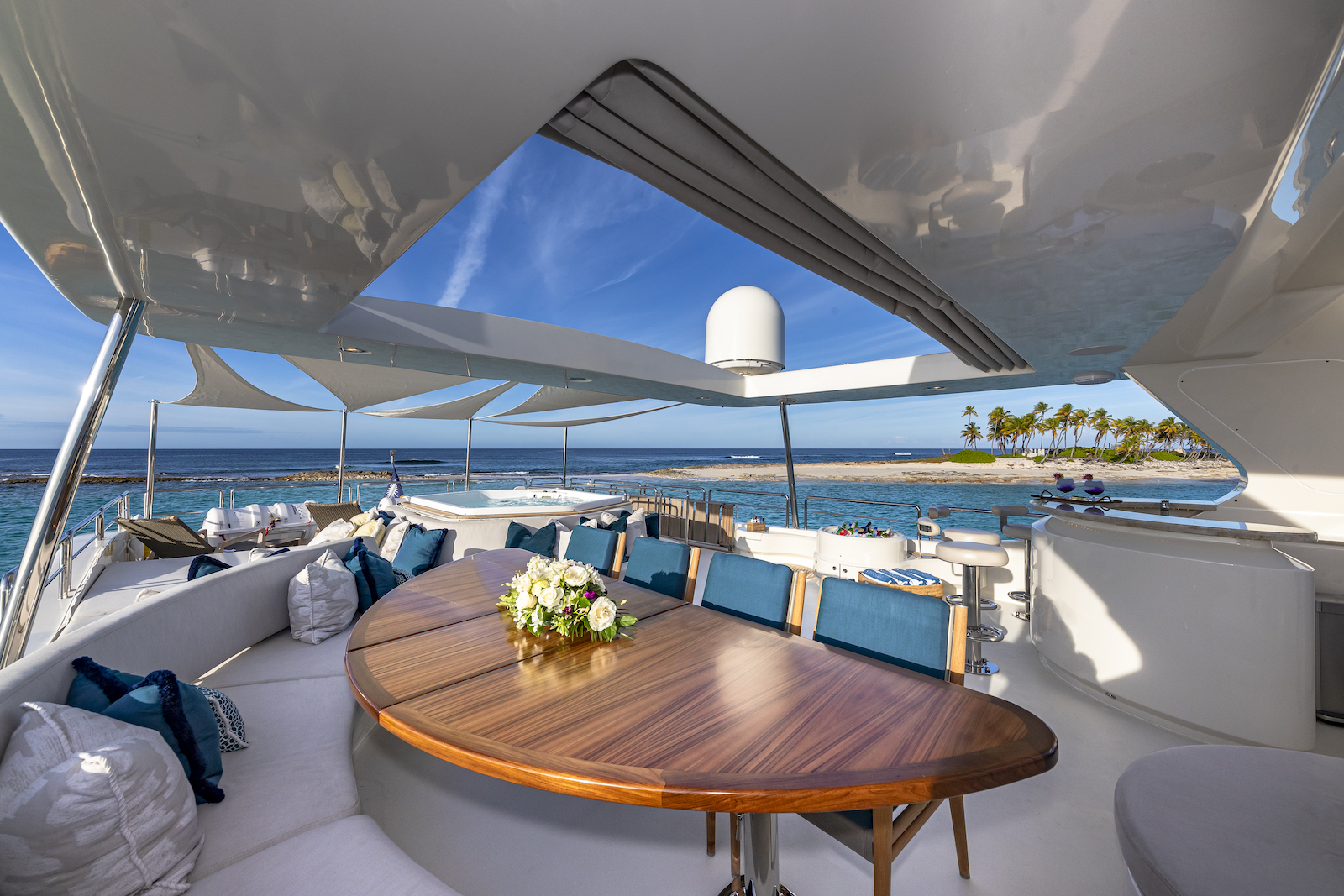 Stairways connect up to the main deck aft, where there is a sofa lining the stern, a raised table for alfresco dining and additional movable chairs. A TV is placed in the forward starboard corner where bar and grill services are ...