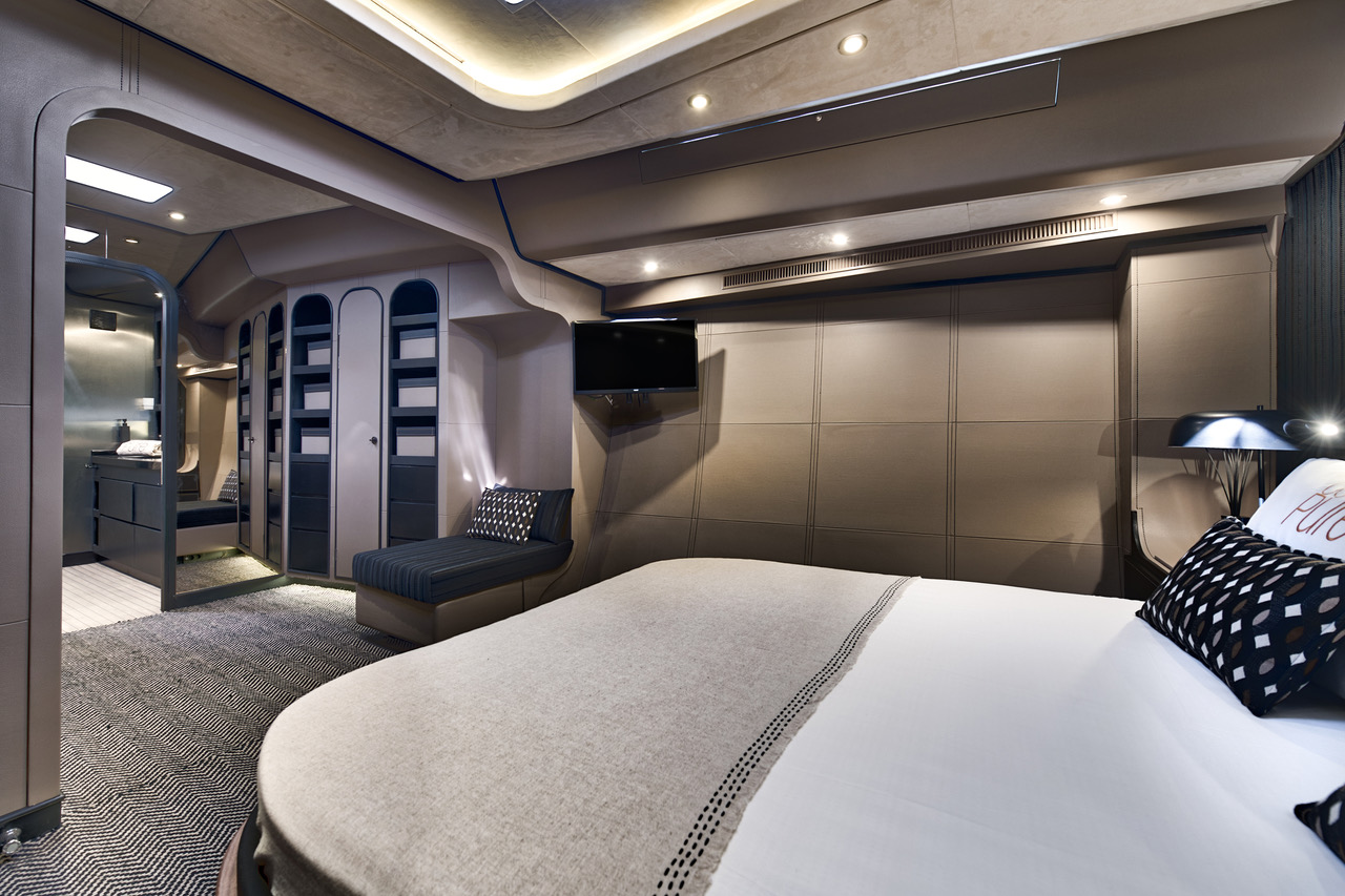 Glass sliding doors to the aft open out onto a spacious main deck cockpit for indoor/outdoor flow ideal for hosting dockside gatherings.