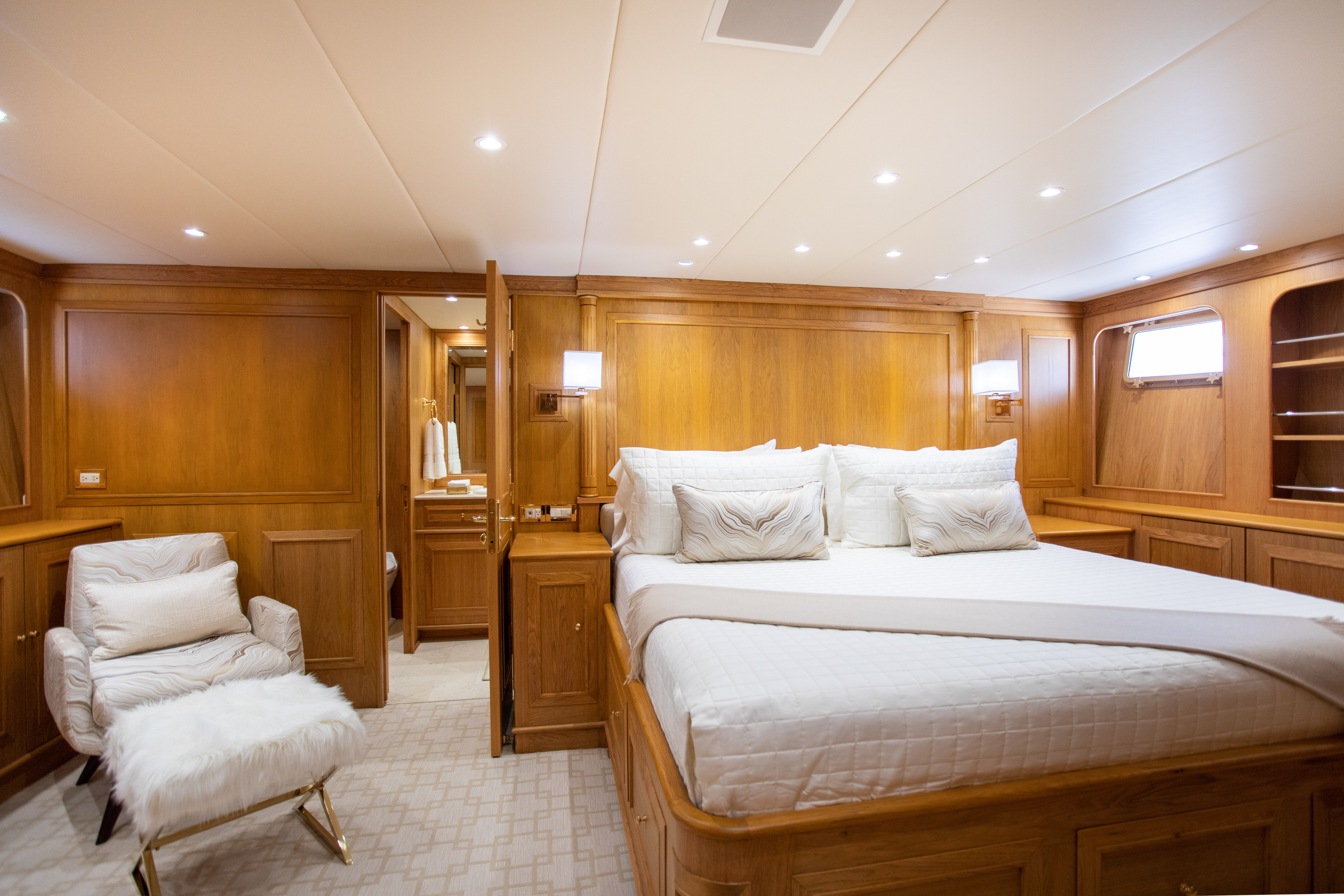 Behind an aft-facing L-shaped sofa is placed to port with four nesting Eichholtz gold coffee tables, a Romo armchair and a chaise-lounger, while the cabinetry along the opposite wall conceals a pop-up widescreen TV.