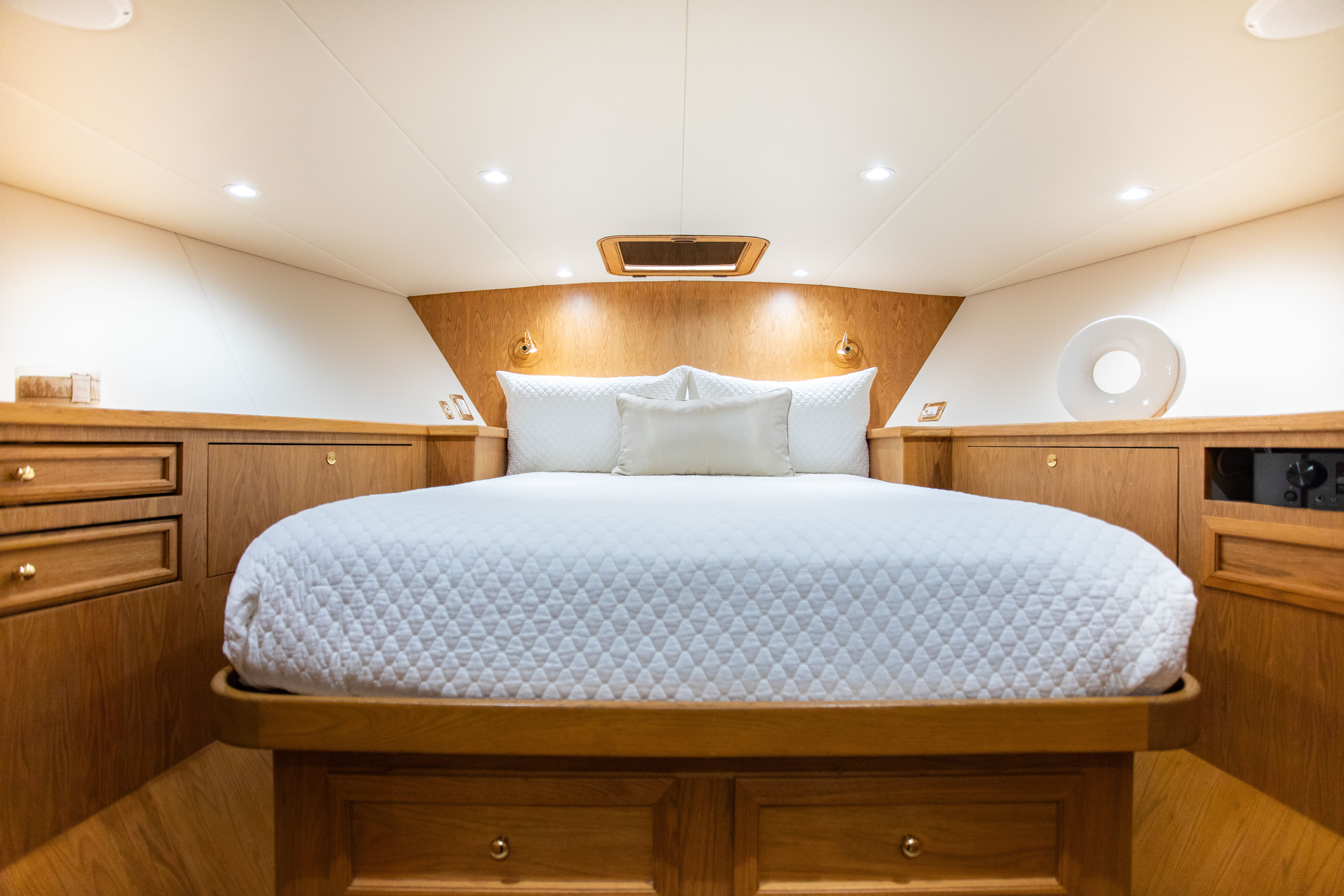 Behind an aft-facing L-shaped sofa is placed to port with four nesting Eichholtz gold coffee tables, a Romo armchair and a chaise-lounger, while the cabinetry along the opposite wall conceals a pop-up widescreen TV.