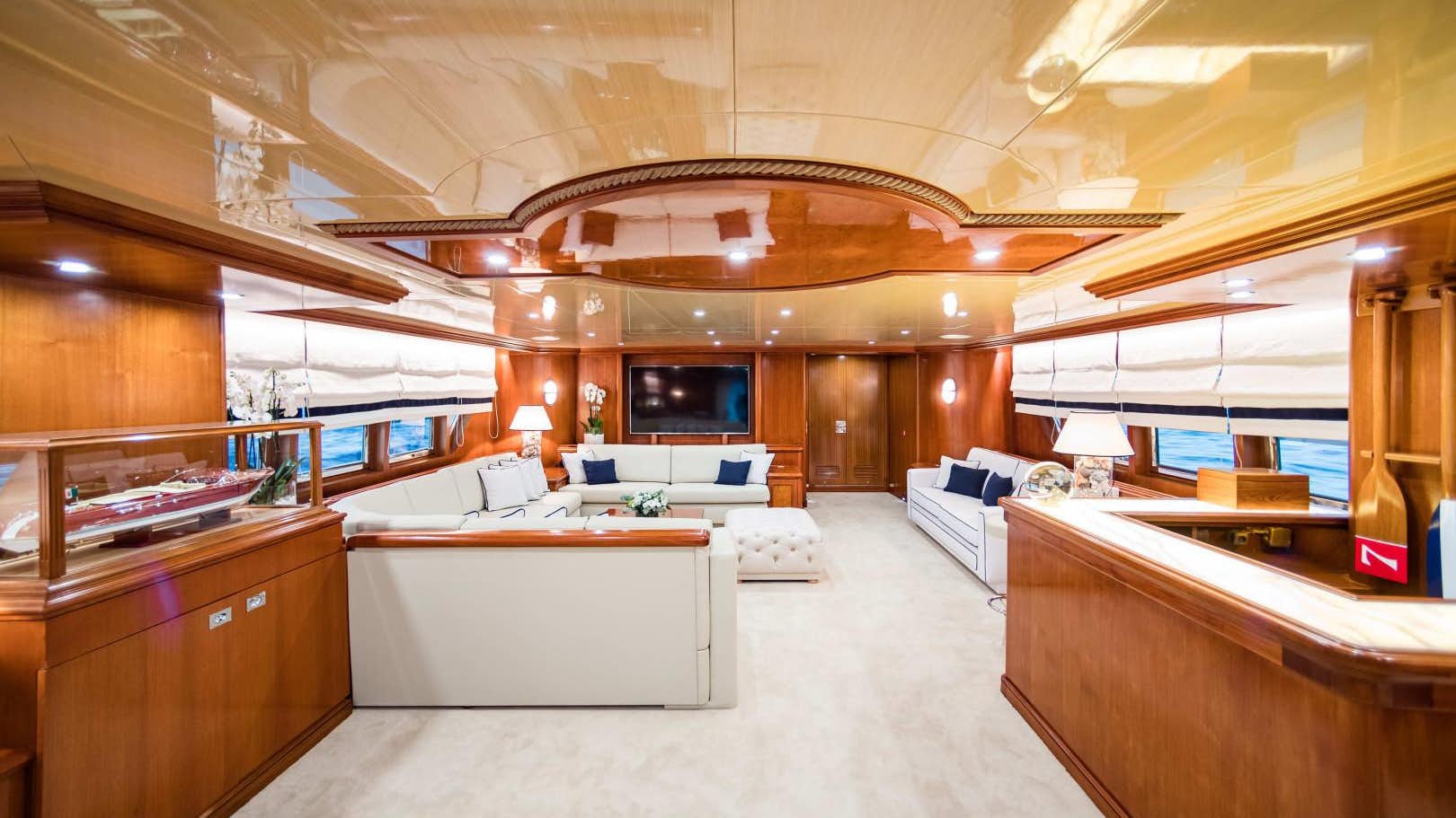 The main salon provides a TV entertainment area forward to port, where a corner sofa, aft-facing sofa, armchairs and a coffee table create a cosy environment for games and conversation.