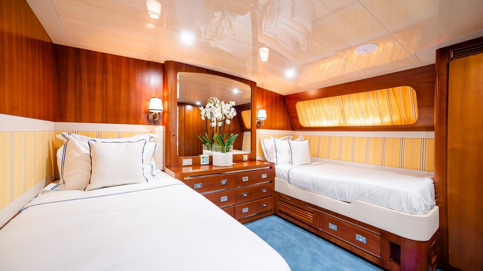 Welcoming deluxe accommodation is offered to up to 12 charter guests in 7 cabins, while a crew of 11 provides high-quality service for a relaxed charter holiday on board.