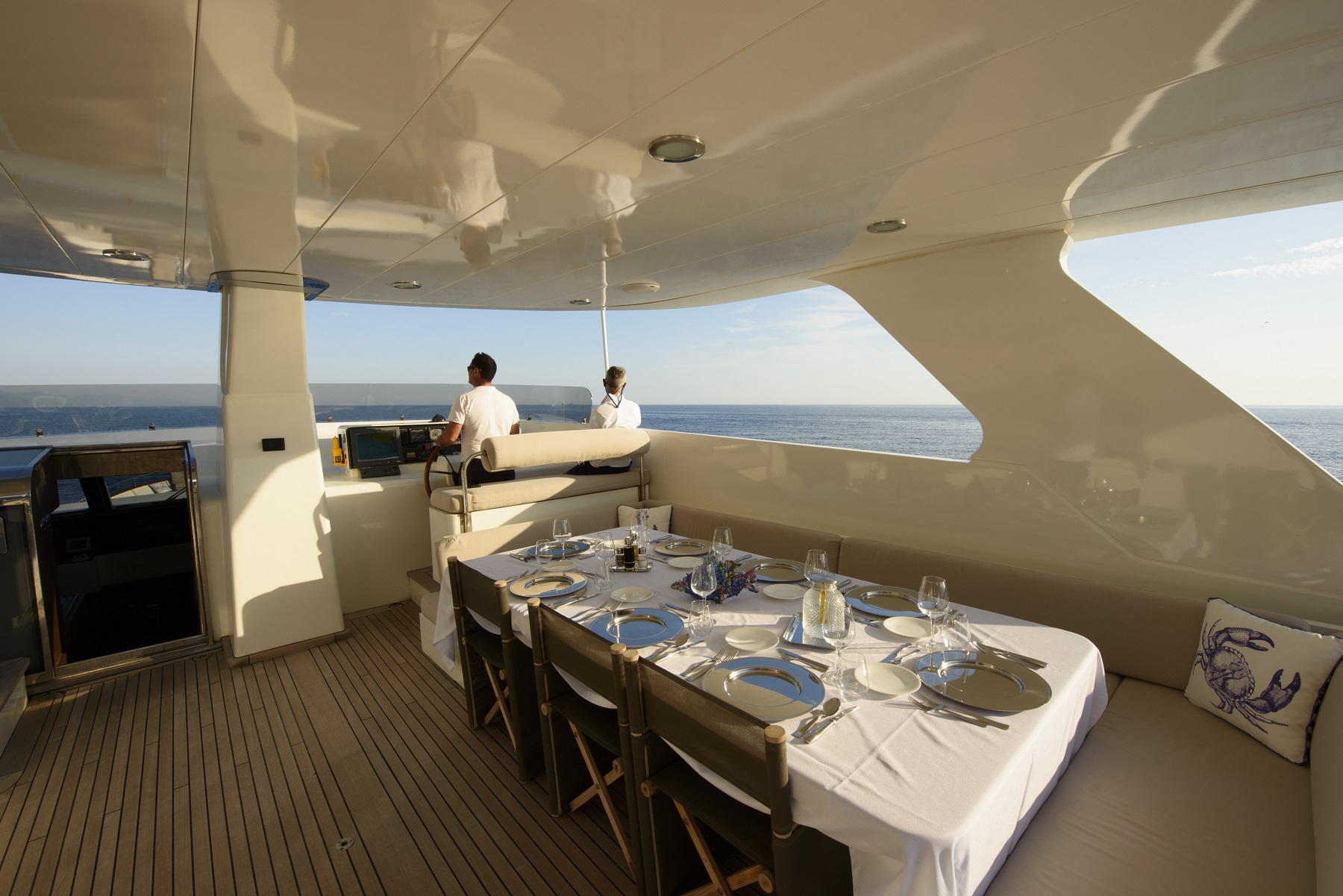 The main deck aft provides a great setting for alfresco dining as a group: The circular dining table seats up to six for intimate meals and sweeping views of the location while sheltered by the flybridge overhang.