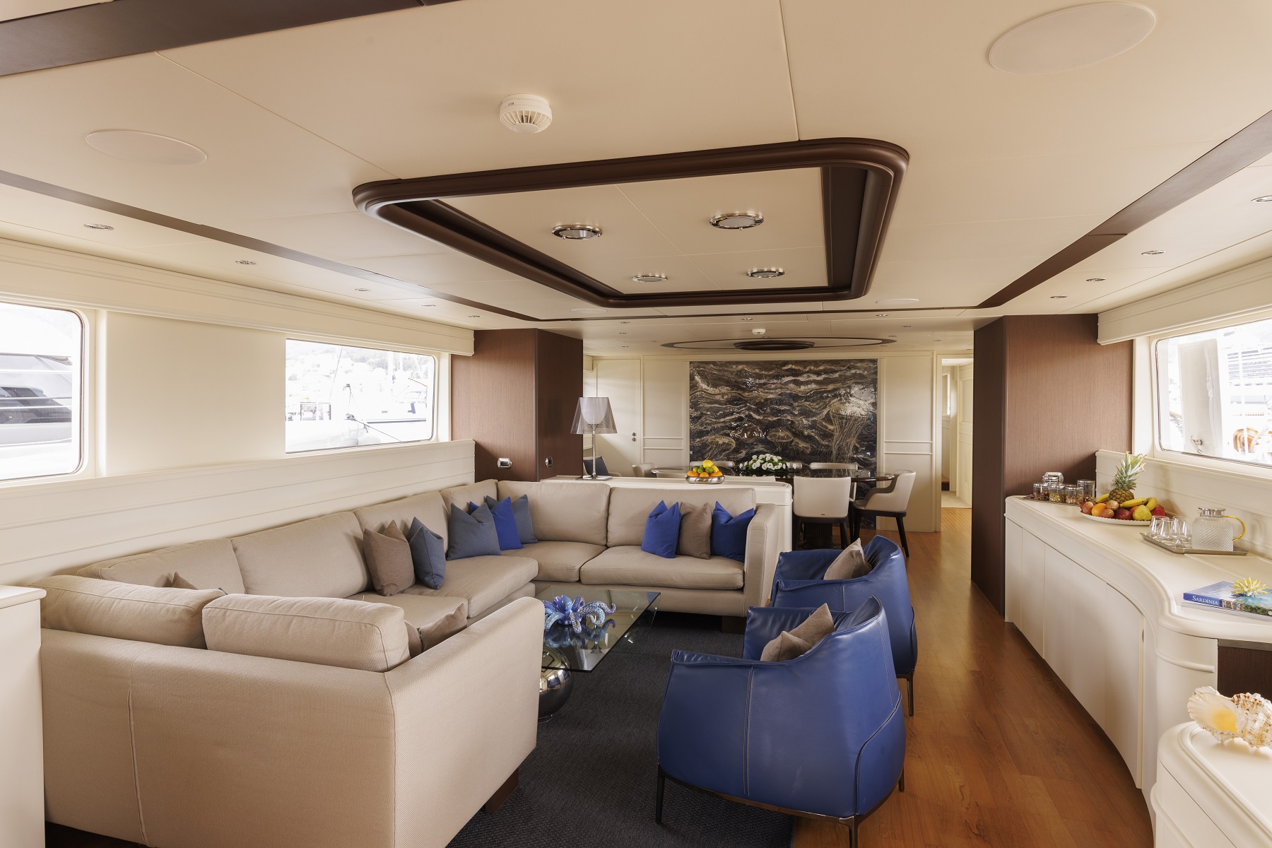 The lower deck hosts the guest and crew accommodation, with the main deck hosting the Master suite forward followed by the galley amidships and the formal dining area and main salon behind.