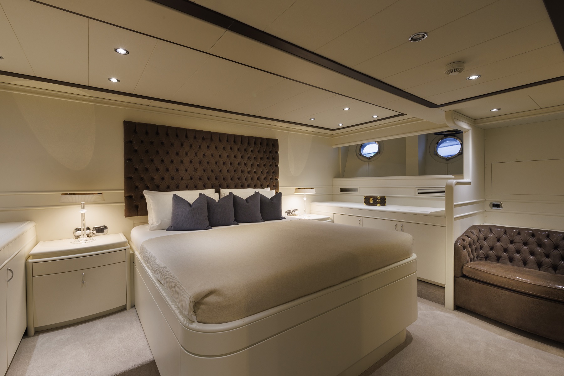 Accommodation spreads over four ensuite cabins, sleeping up to ten guests in total, with a professional crew of five on board.