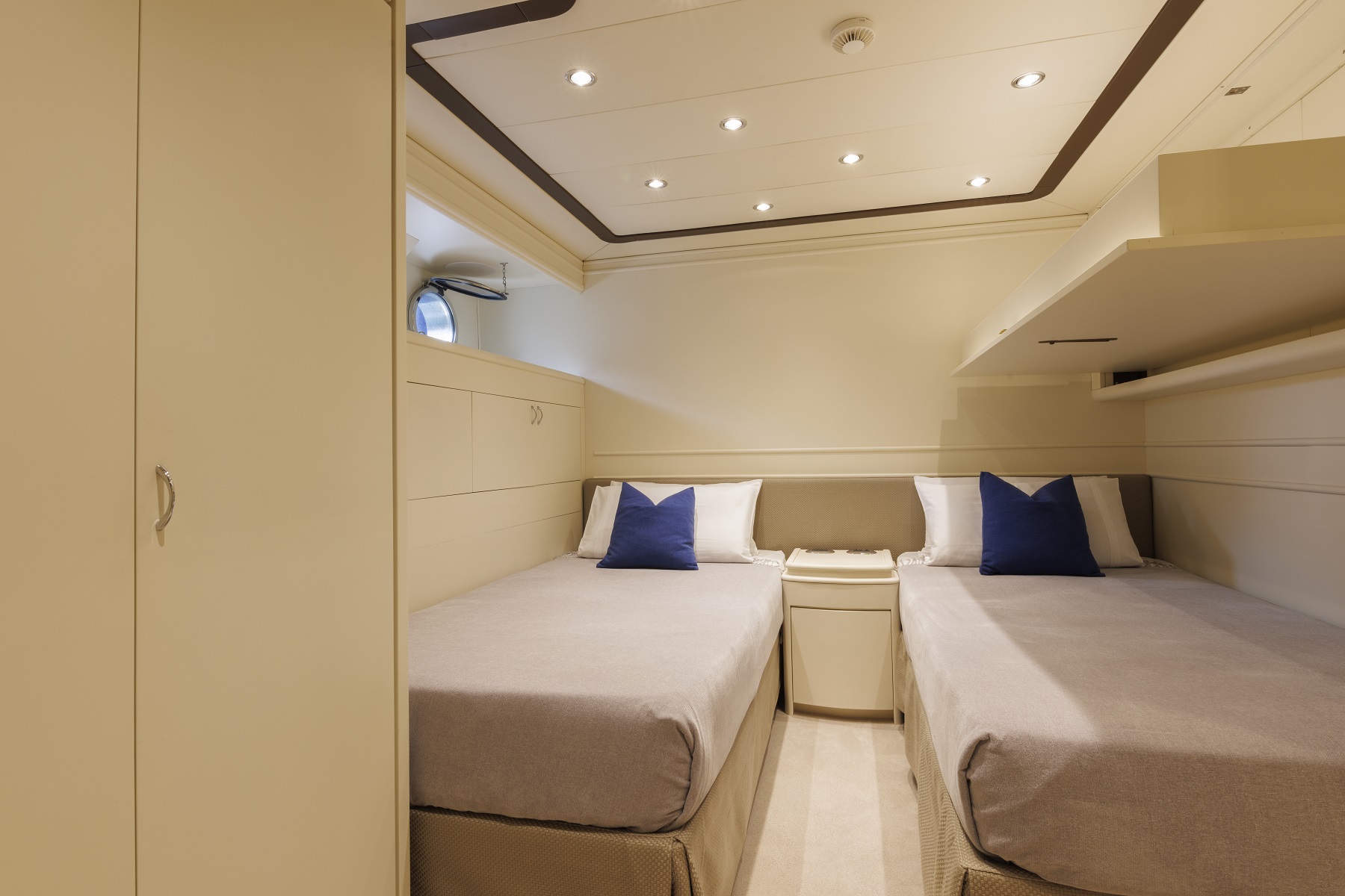 Accommodation spreads over four ensuite cabins, sleeping up to ten guests in total, with a professional crew of five on board.