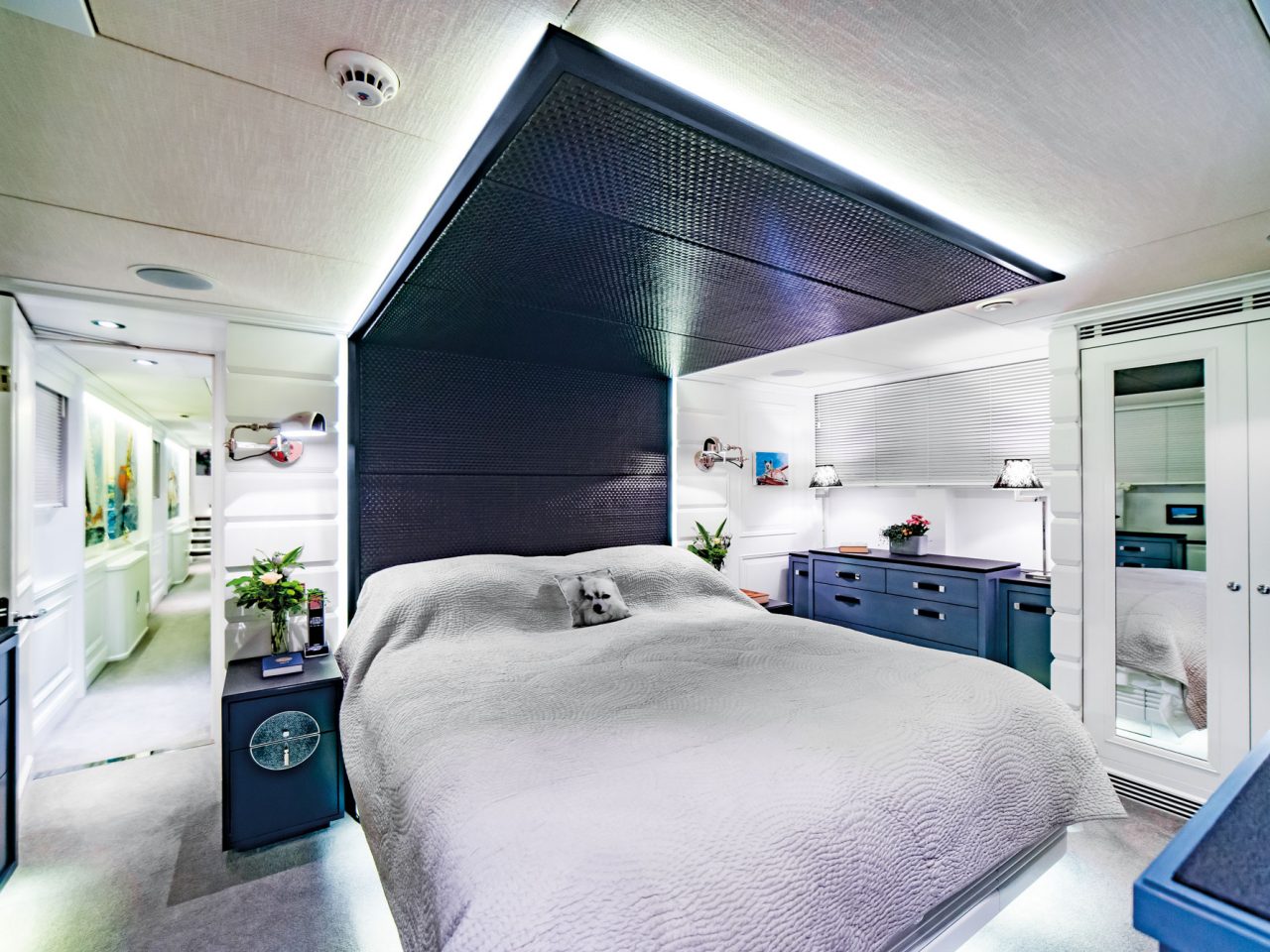 The king-sized bed is surrounded by side tables and an abundance of lighting, with large circular windows for a bright interior. The en-suite bathroom contains a toilet, sink, shower and bathtub.