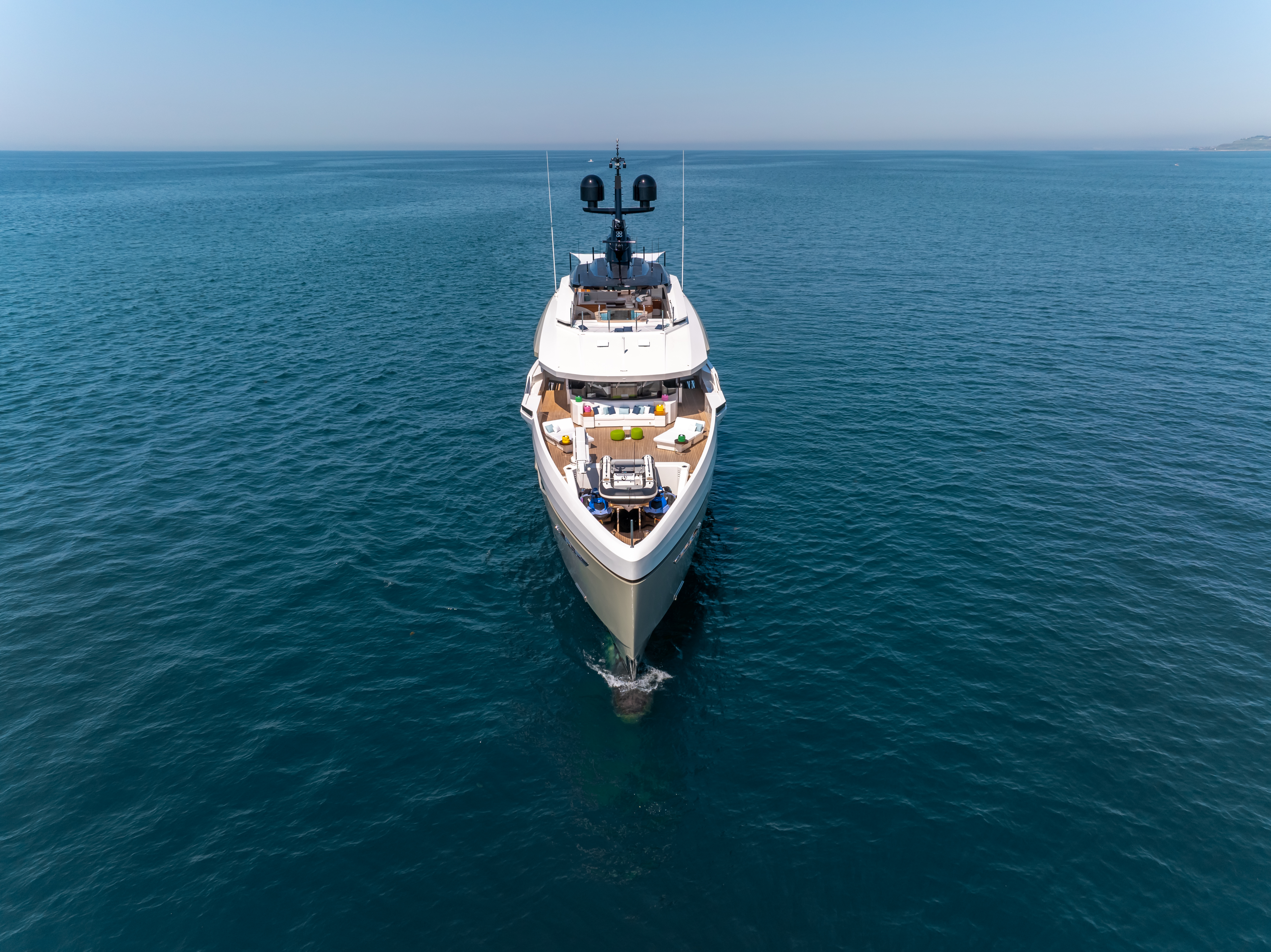 A starboard staircase connects to the upper deck aft, while the foredeck can be accessed via the port and starboard side walkways around the exterior of the main salon that lead to stairways.