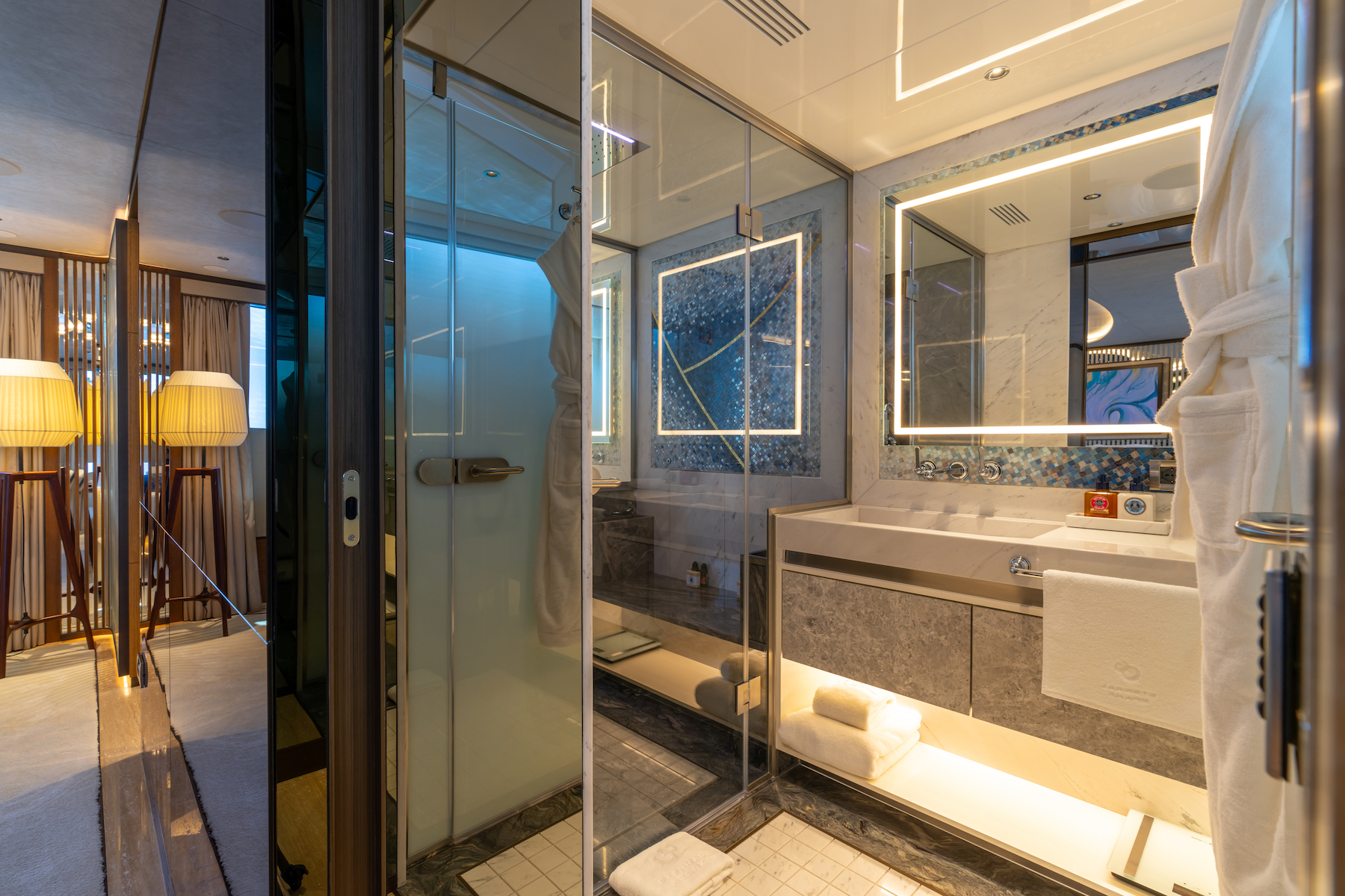 ~ The VIP stateroom is located aft of amidships on the lower deck and makes use of the full beam to create a spacious environment.