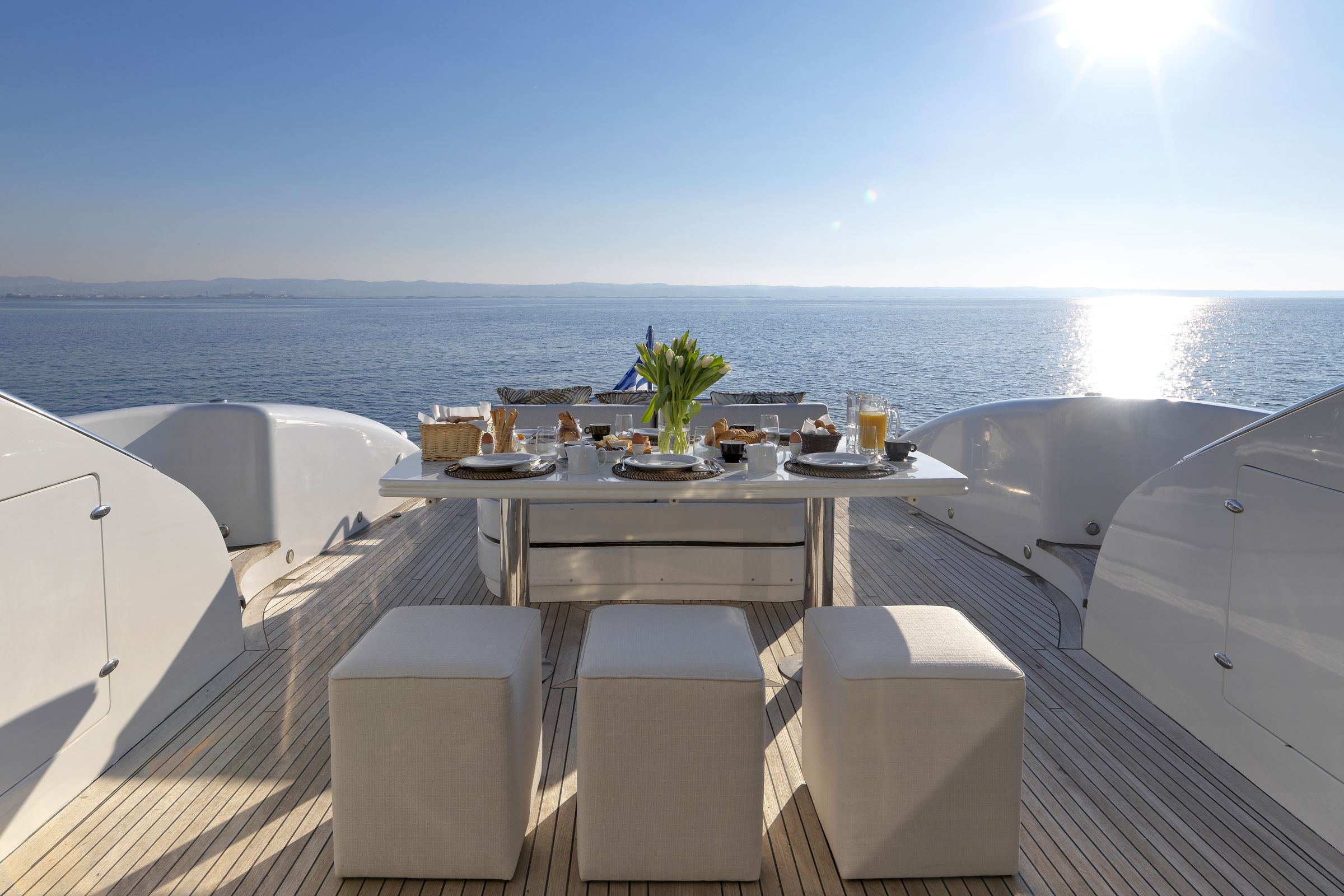 The lower deck swim platform stores the tender while in transit, and on the main deck aft there is ...