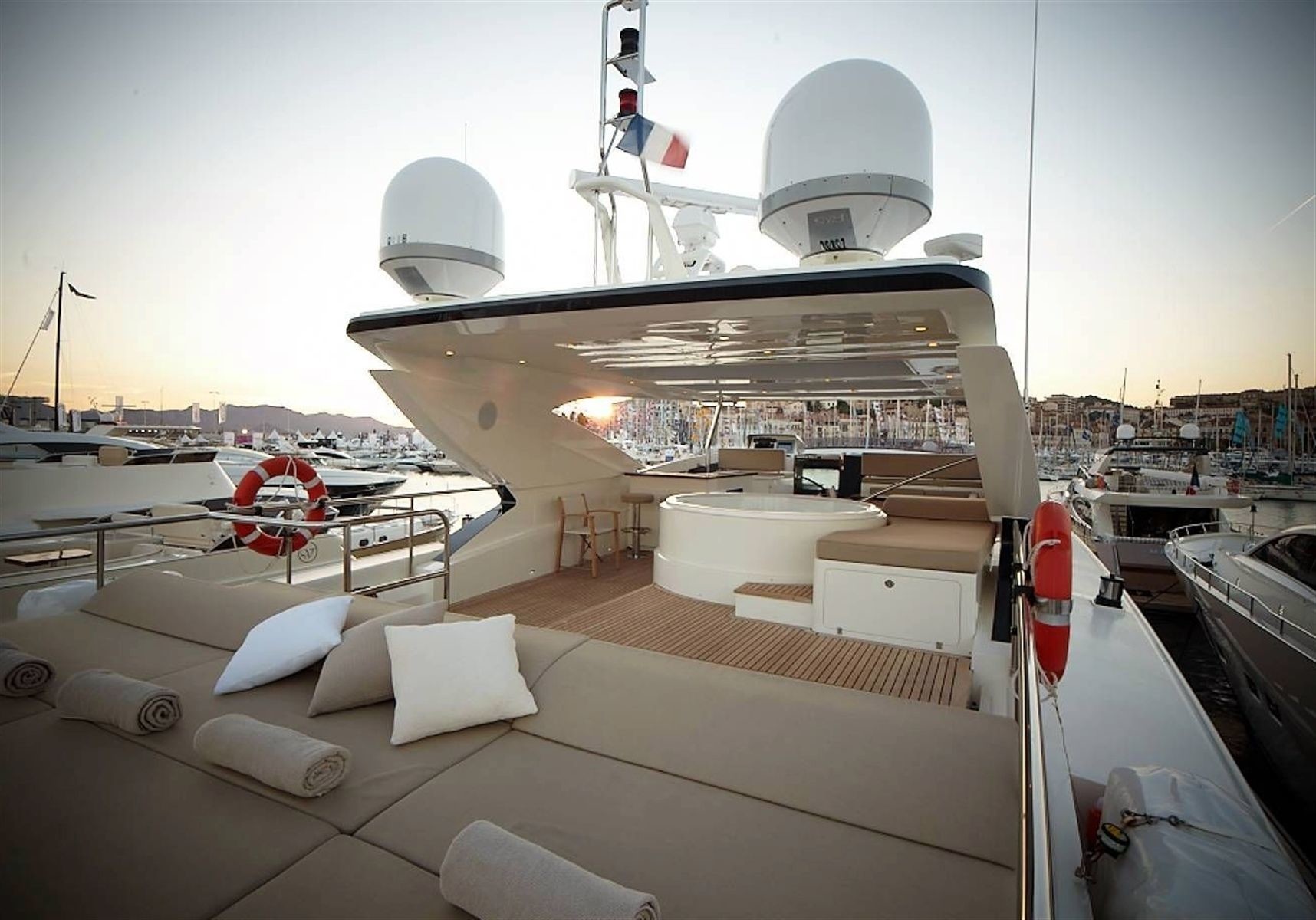 The foredeck has a C-shaped sofa and table for drinks at sunset, while the flybridge has a row of sunbeds covering the stern and a Jacuzzi amidships.