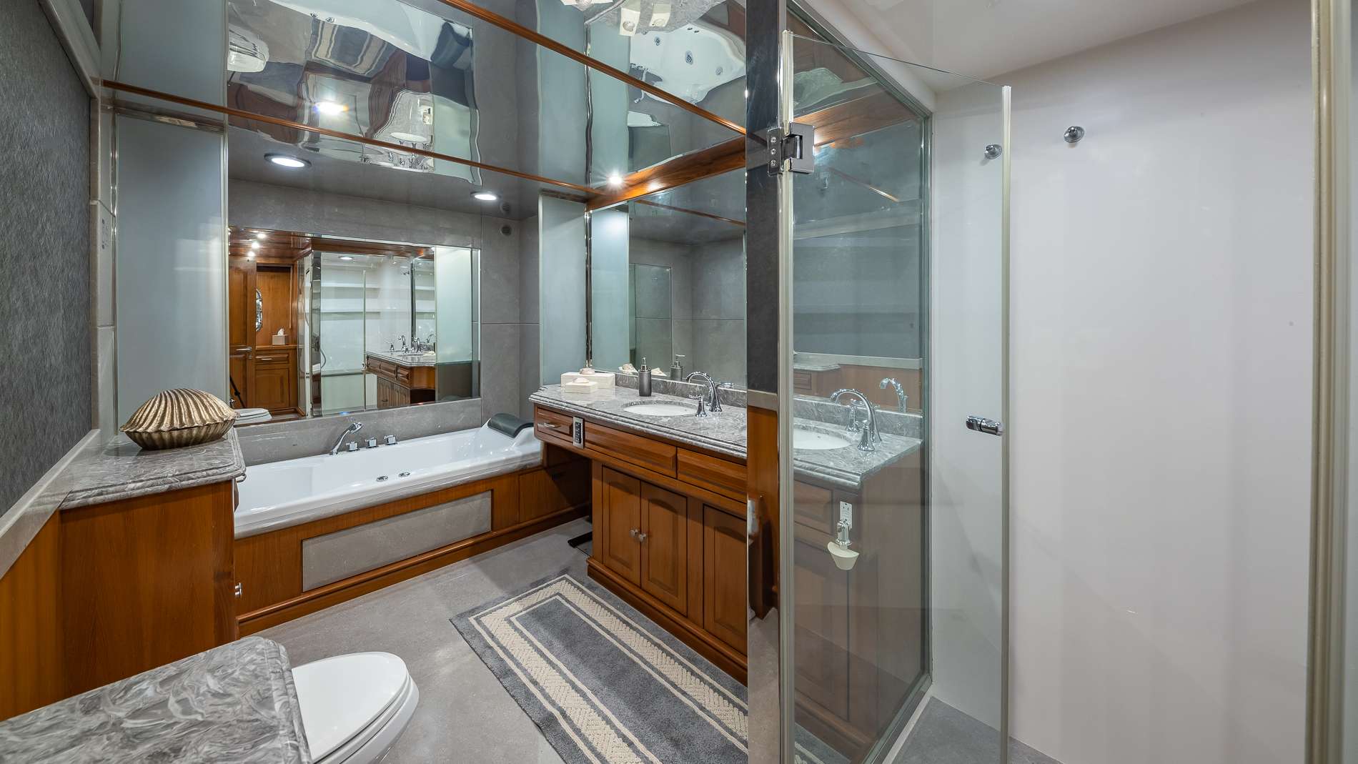 The en-suite bathroom boasts a Jacuzzi tub in addition to a shower and his-and-hers sinks and toilets to port and starboard.
