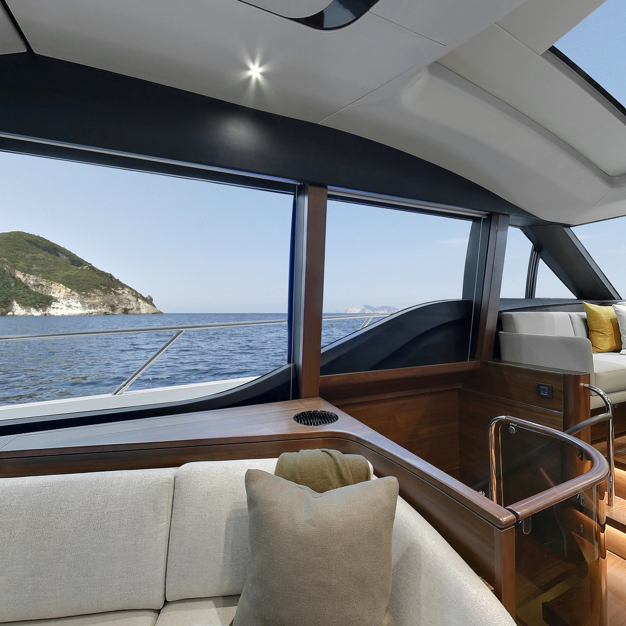On the inside, the bridge is located forward followed by the beautiful saloon, socialising area amidships and the modern galley placed aft, together with a dining area, which flows effortlessly onto the aft exteriors thanks to large glazed windows. The entire main deck offers plenty of natural light thanks to large windows.