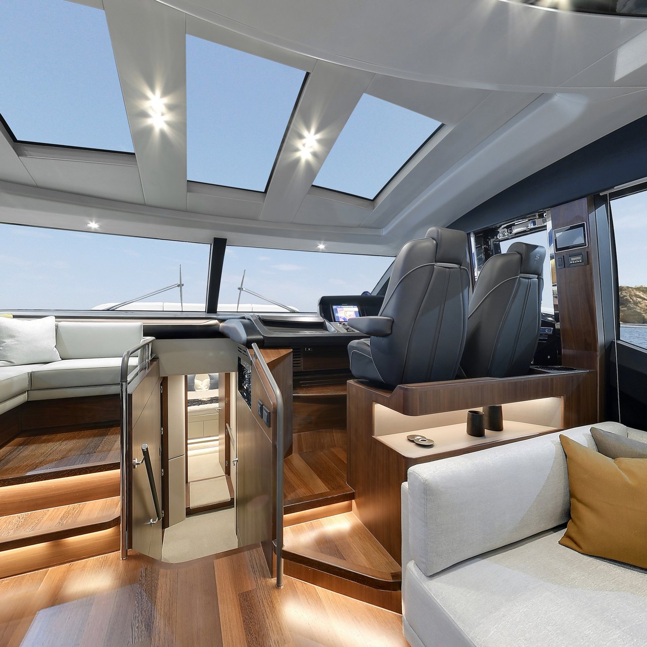 Her flybridge provides guests with a possibility to relax on an l-shaped sofa around the low drinks table and enjoy the fantastic views from the top of the yacht, with additional seating on both sides of the helms station placed forward.
