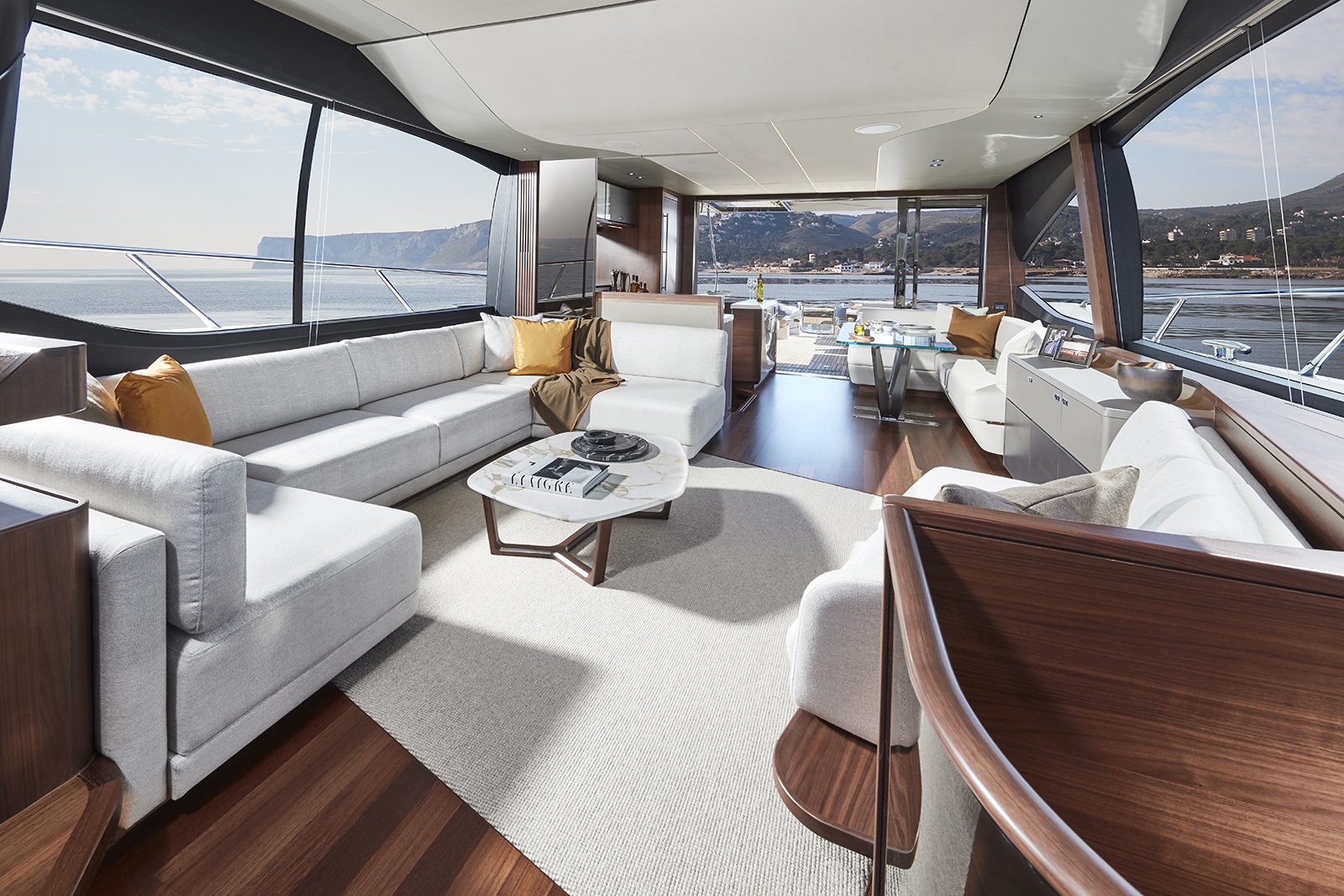 On the inside, the bridge is located forward followed by the beautiful saloon, socialising area amidships and the modern galley placed aft, together with a dining area, which flows effortlessly onto the aft exteriors thanks to large glazed windows. The entire main deck offers plenty of natural light thanks to large windows.