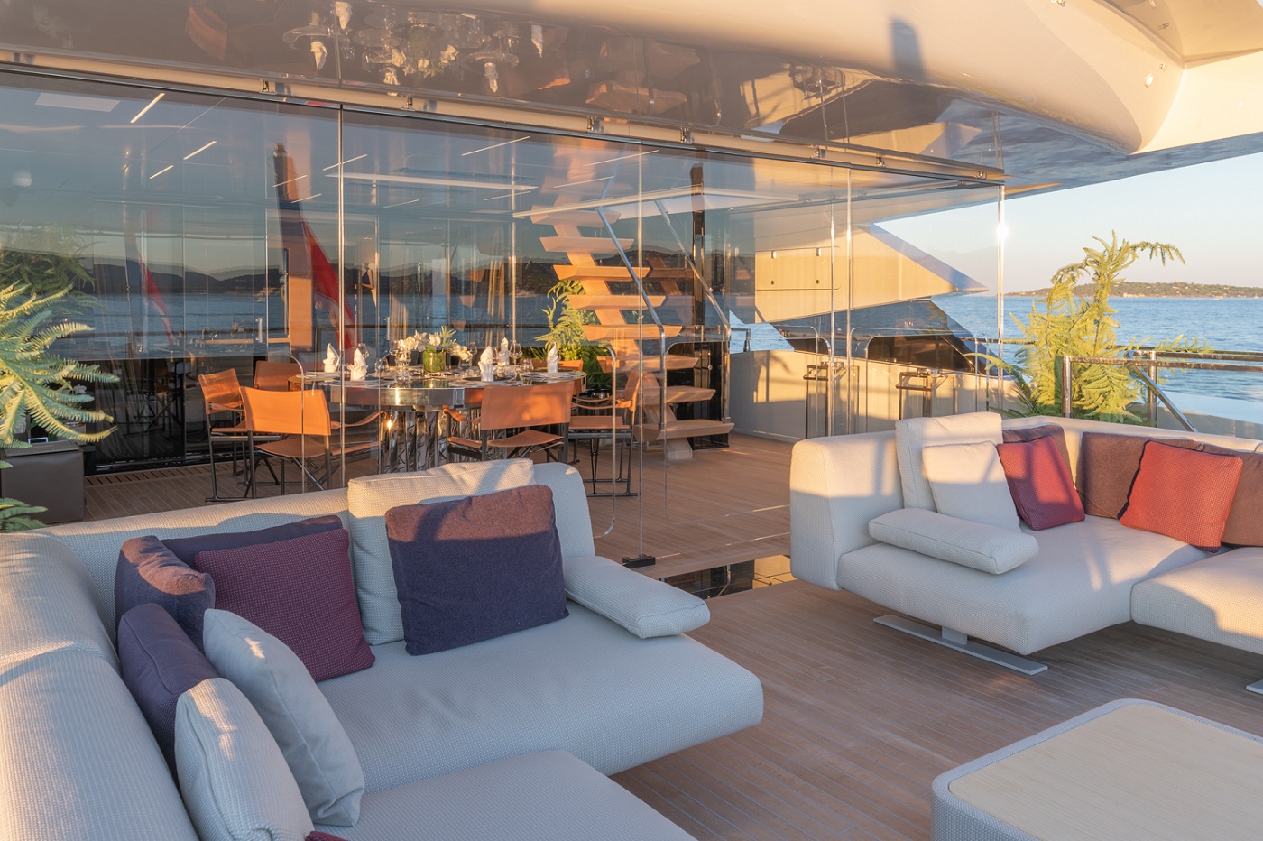 The main deck aft is laid out with sofas, coffee tables, a bar and sun loungers for relaxation in the sunshine.