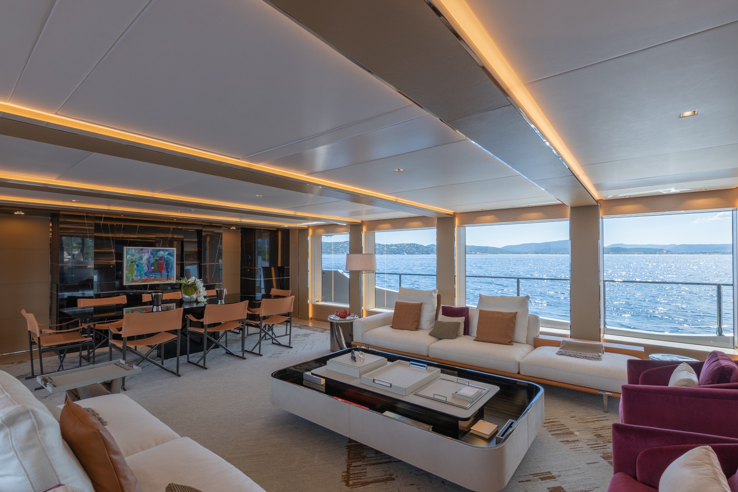 The upper deck features a lovely alfresco dining area which can be enclosed for use in all seasons and weather conditions thanks to outdoor heating and an indoor air-conditioning system for this versatile space.